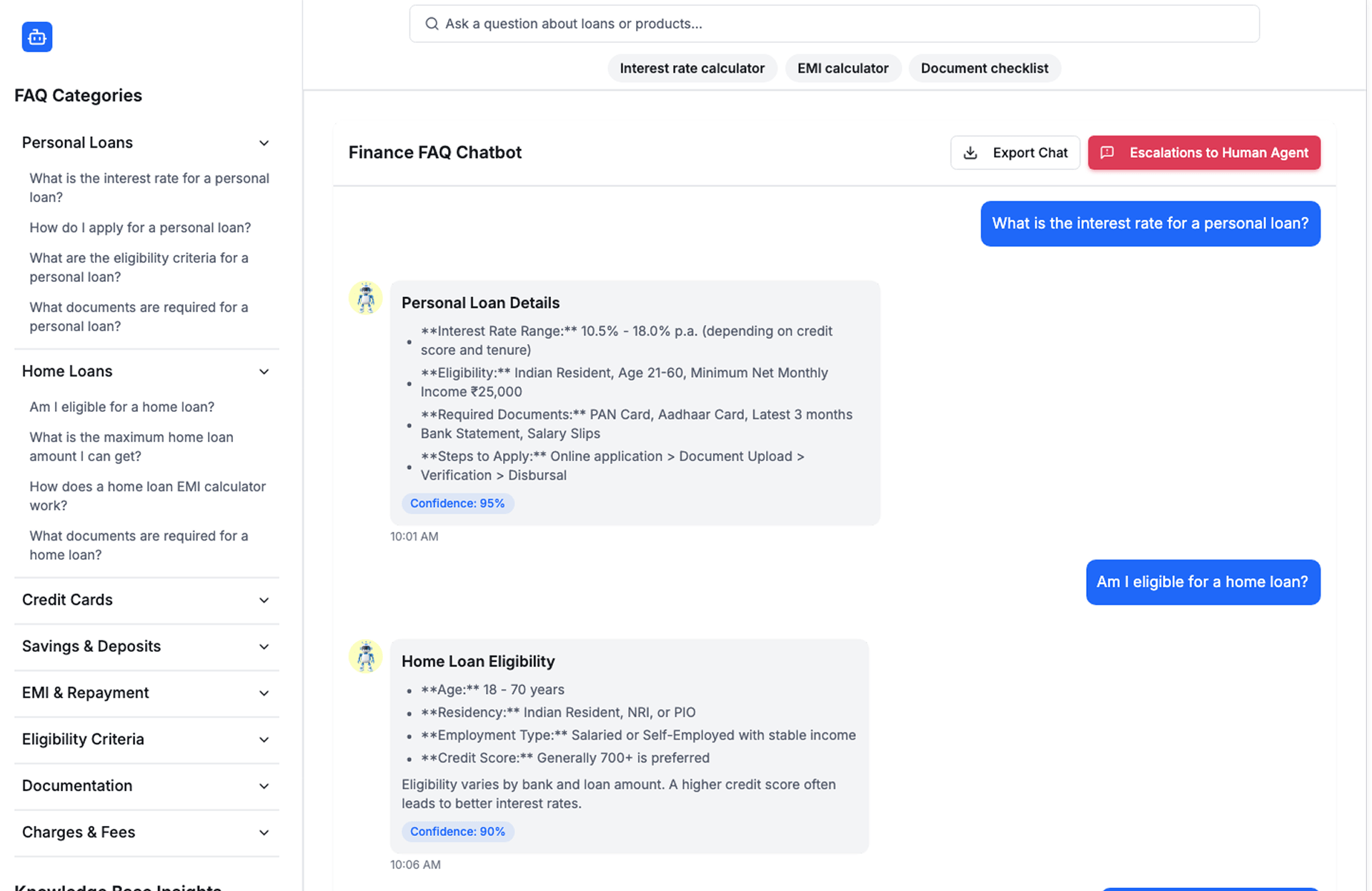 The Finance FAQ Chatbot is an intelligent conversational assistant trained on your finance policies, documents, and workflows. It responds to frequently asked questions, guides users to the right information, and escalates complex queries when needed.