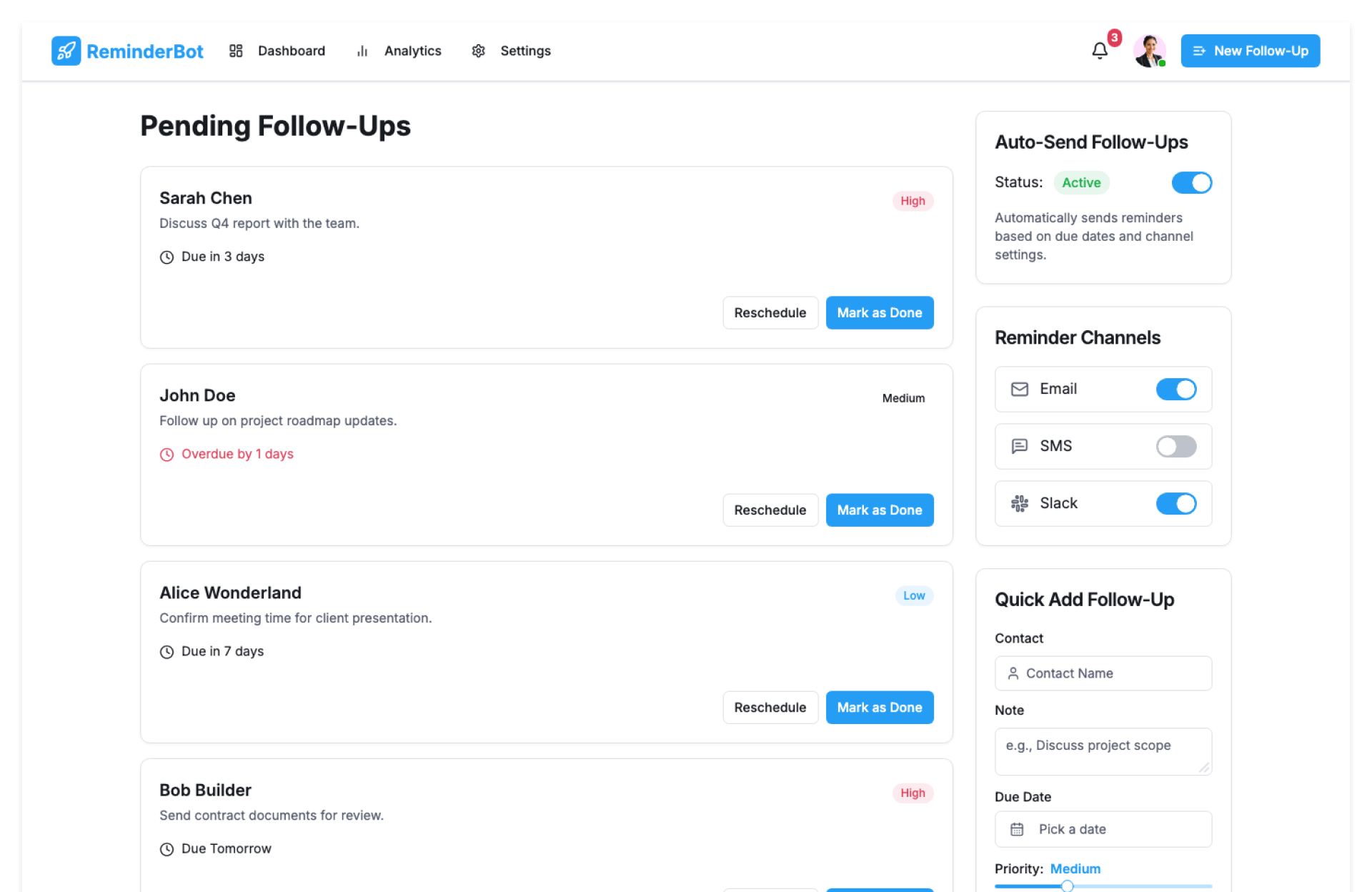 The Follow-Up Reminder Bot is a ready-to-deploy automation tool that monitors customer interactions and automatically sends reminders, alerts, or tasks based on predefined rules or AI-driven insights. It helps teams stay proactive, responsive, and consistent without manual tracking or spreadsheets.