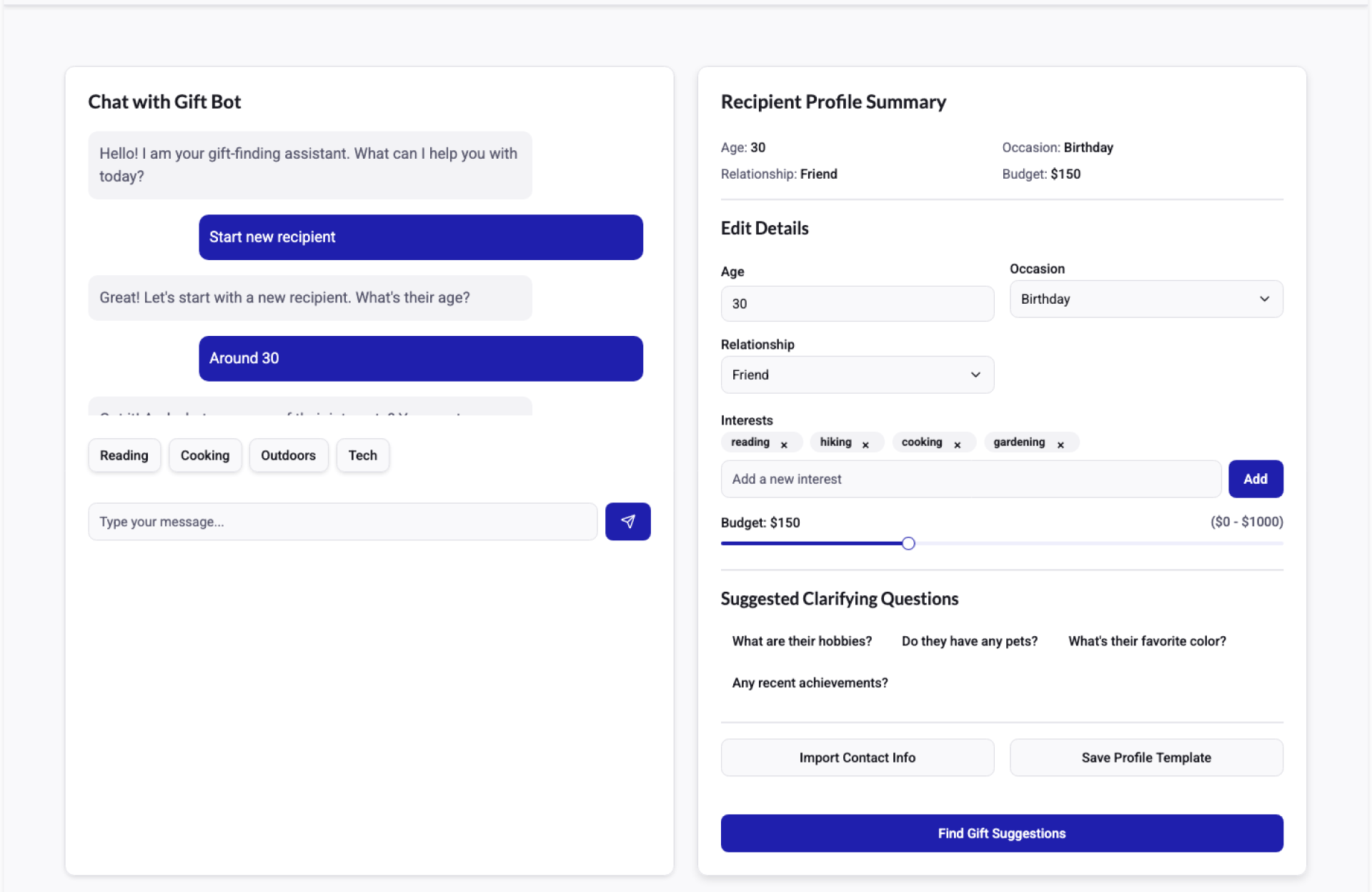The Gift Finder Chat Assistant is a ready-to-deploy conversational AI that interacts with customers in real time to recommend ideal gifts. By asking smart, guided questions—such as recipient age, interests, occasion, and price range—it delivers highly relevant product suggestions, reducing decision fatigue and increasing purchase confidence.