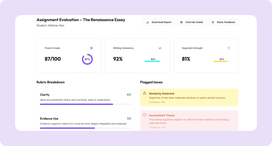 Yes. The AI evaluates structure, coherence, and relevance to grading rubrics.