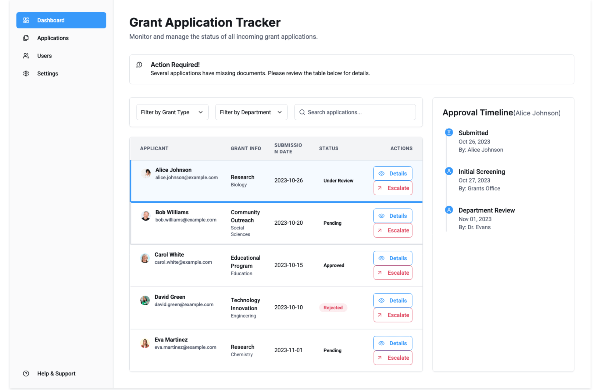 The Grant Application Form Tracker is a centralized system that captures, tracks, and manages grant applications across multiple programs and funding cycles. It enables teams to review submissions, track application stages, assign reviewers, and monitor outcomes—all from a single dashboard.