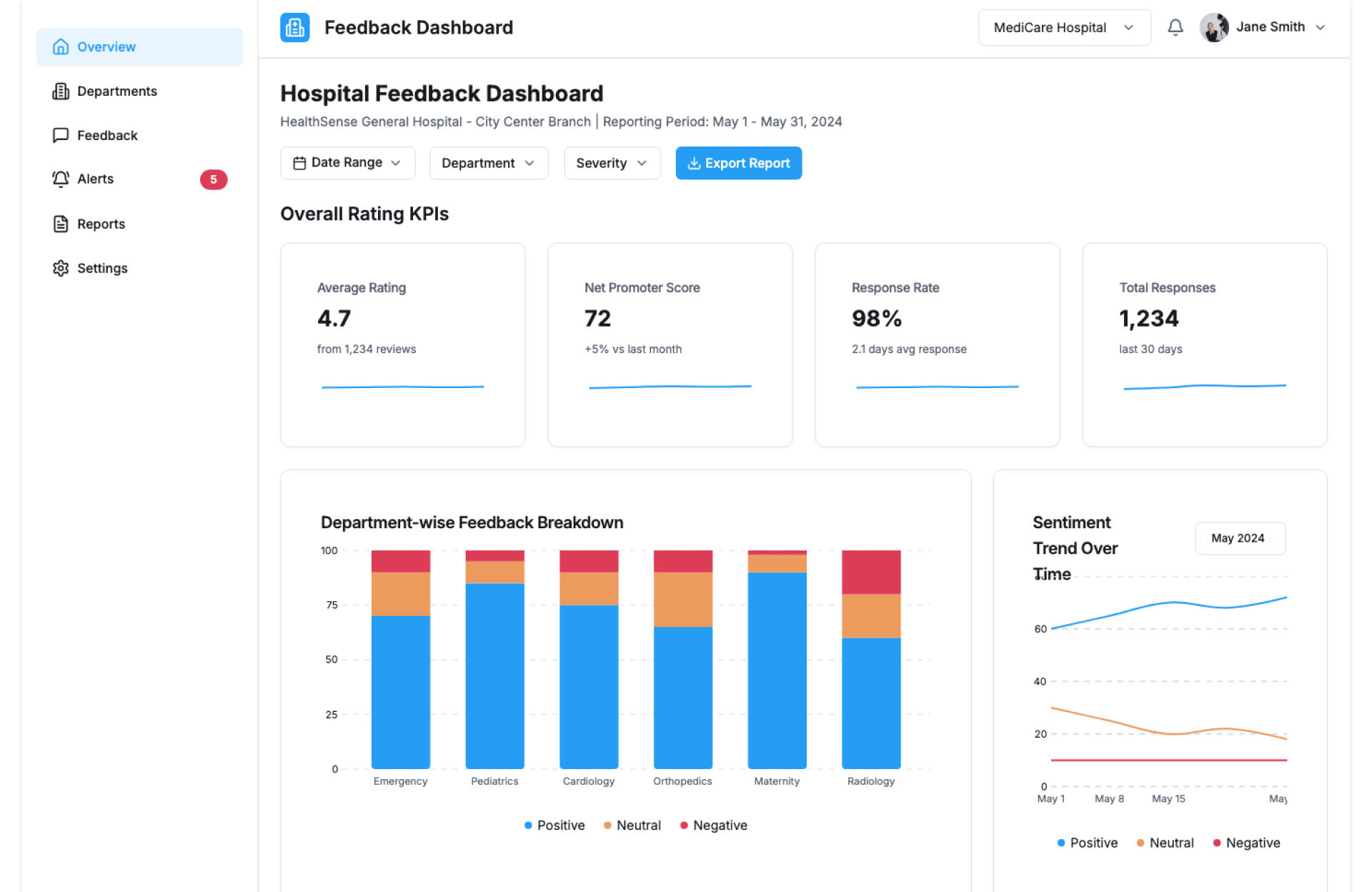 The Hospital Feedback Dashboard is an AI-powered solution that aggregates patient feedback from multiple sources and presents it through intuitive charts and summaries. It helps healthcare teams gain actionable insights into patient experience and service quality.