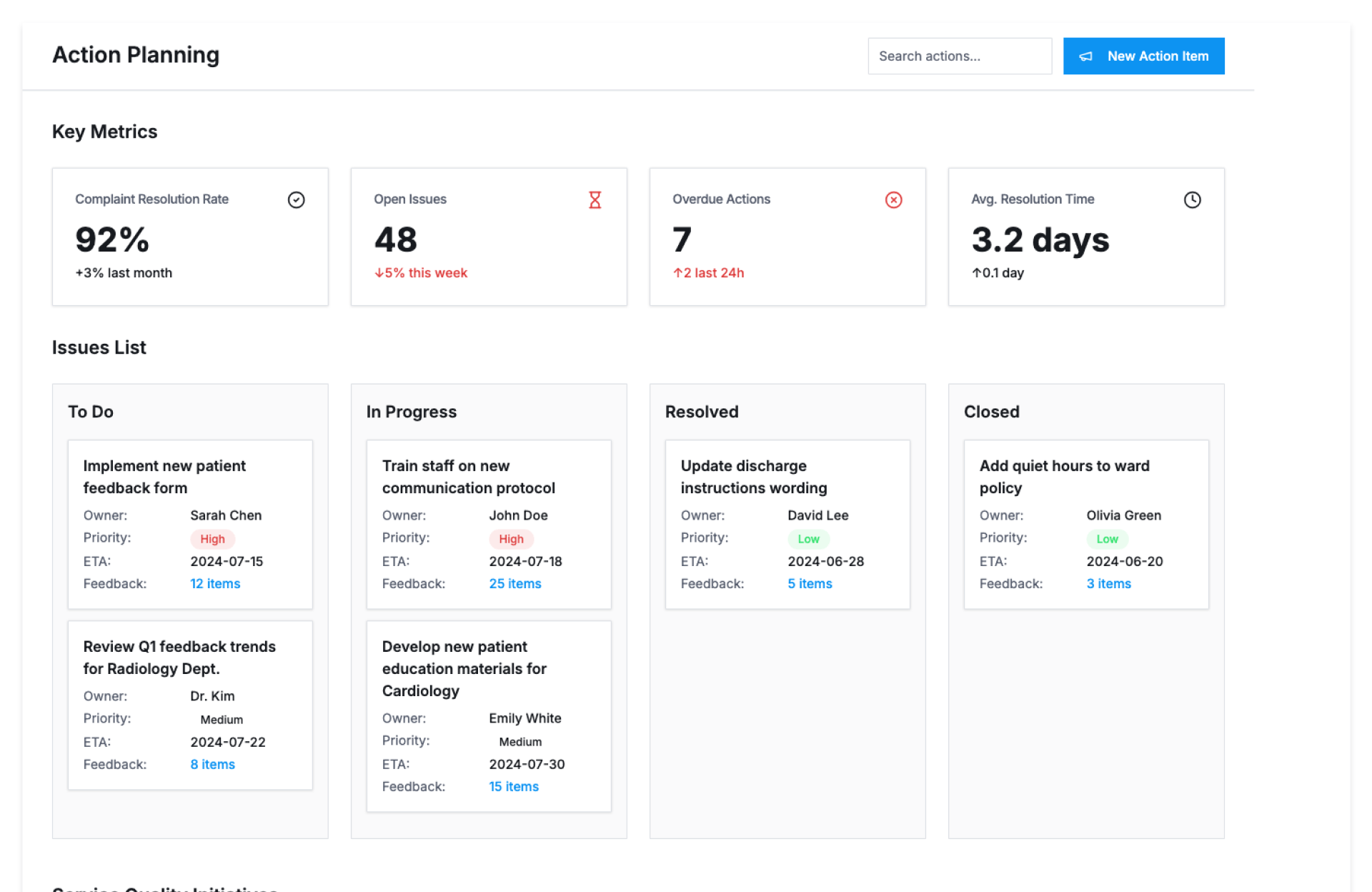 The Hospital Feedback Dashboard by Kriatix helps hospitals and healthcare providers collect, analyze, and visualize patient feedback in a centralized view. It enables leadership teams to track satisfaction trends and identify areas for service improvement.