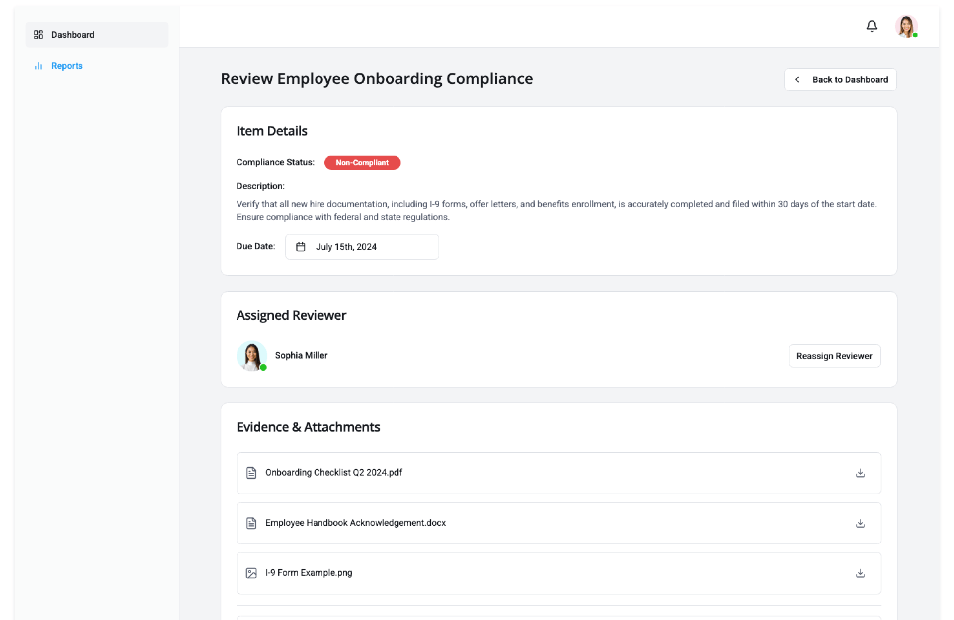 • Compliance status indicators (completed, pending, overdue)