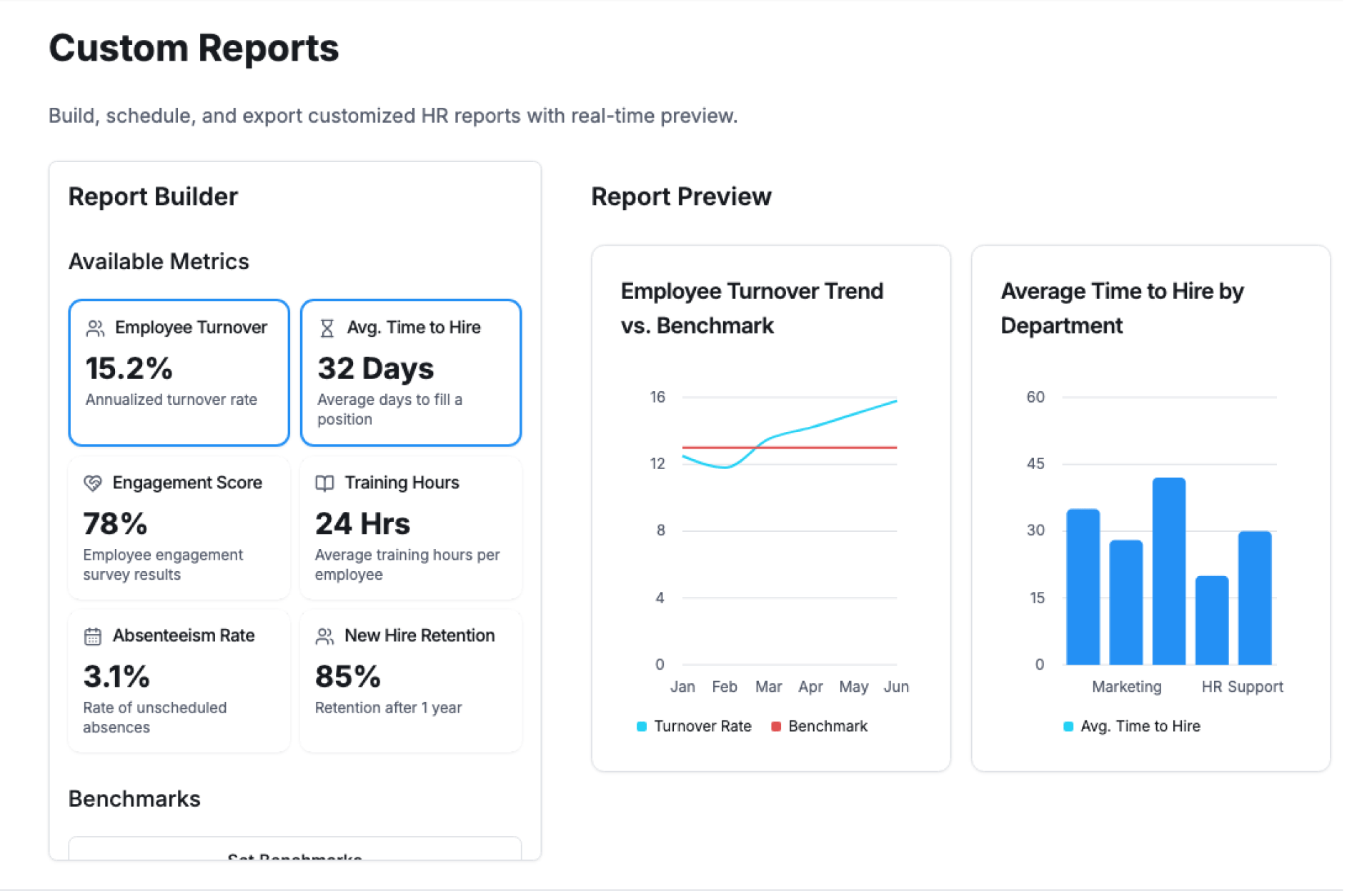 - Select KPIs – Choose from pre-built or custom HR metrics