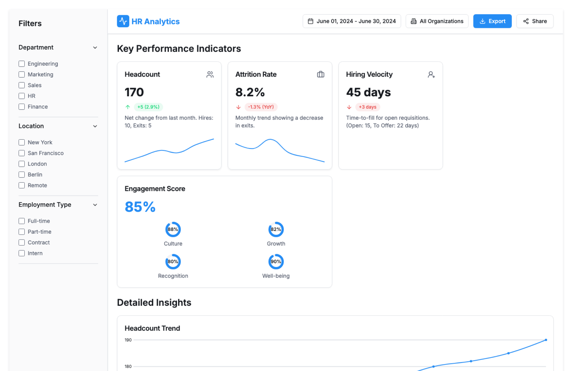 - Hiring funnel and time-to-hire metrics
