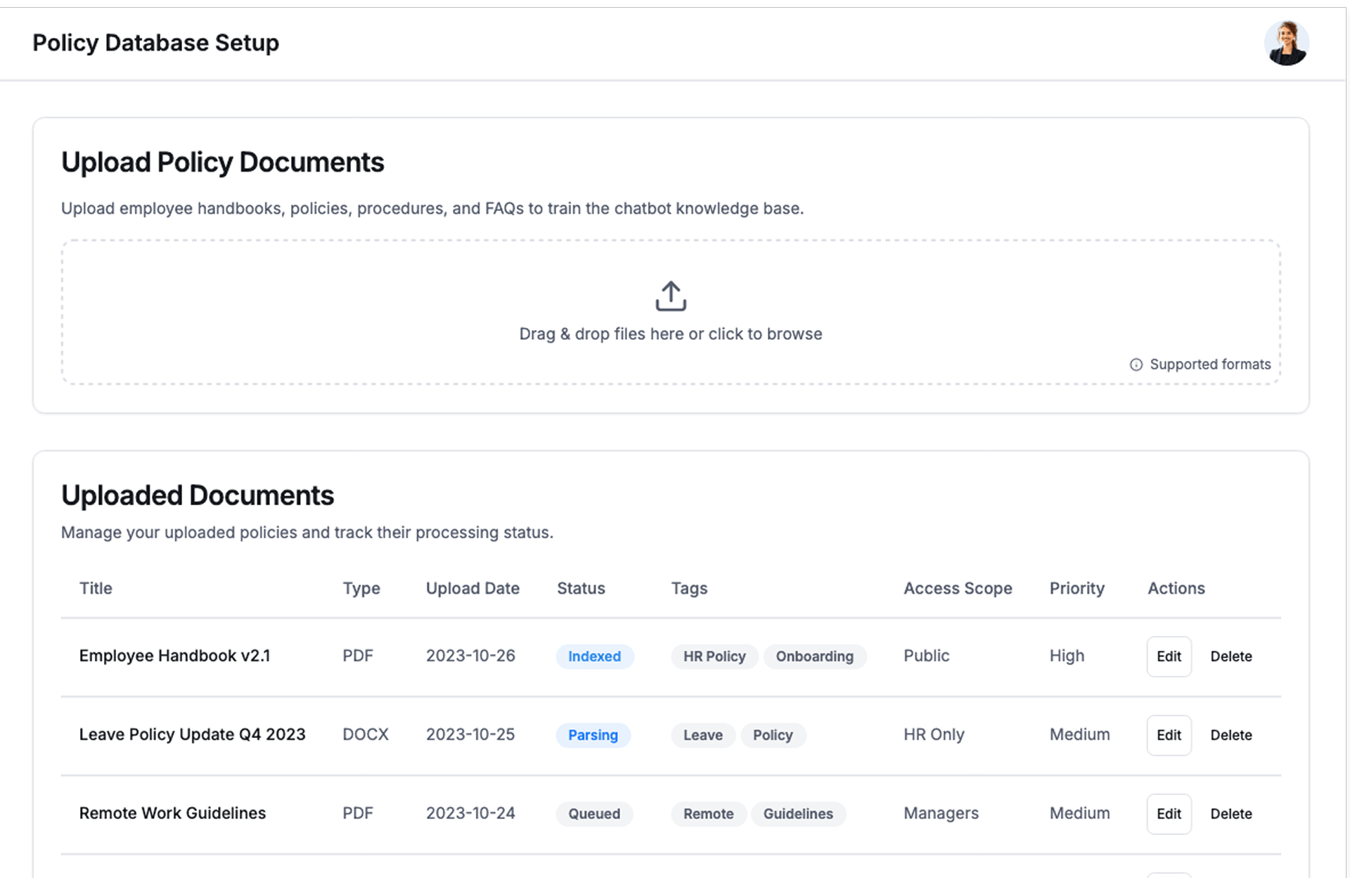 - Train the Chatbot – AI understands and indexes policy content