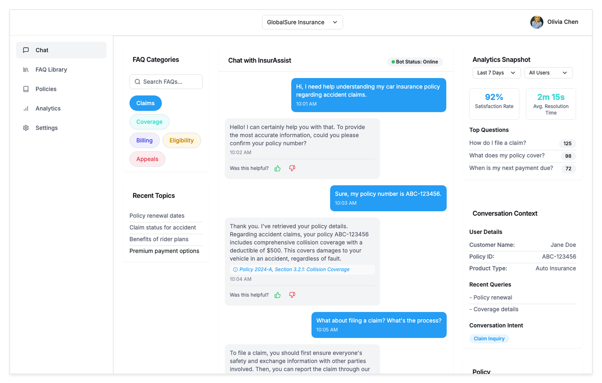 The Insurance FAQ Chatbot is an AI-powered solution designed to handle frequently asked insurance-related questions through conversational interactions. It provides policyholders with quick, clear answers and routes complex queries to human agents when needed.