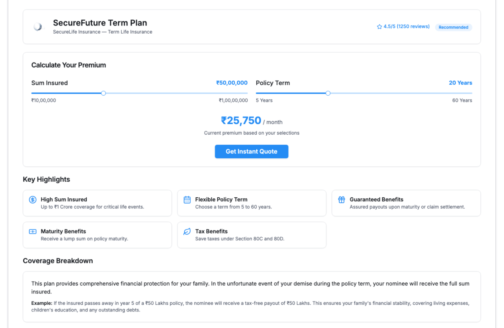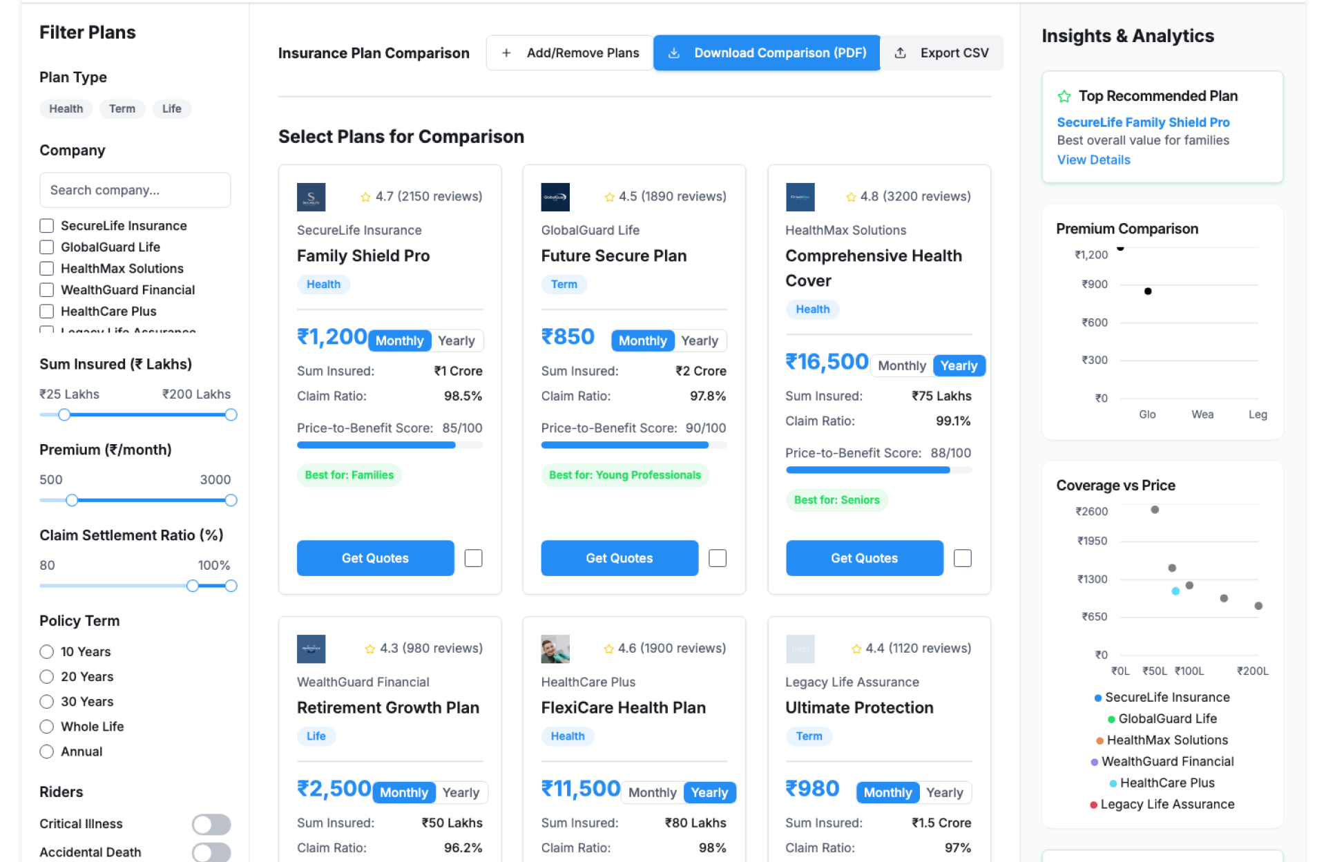 The Insurance Plan Comparison Tool is a configurable dashboard that consolidates policy data from multiple insurers and presents it in a structured, side-by-side format. It highlights differences in coverage limits, premiums, deductibles, riders, and exclusions so users can evaluate plans quickly and objectively.