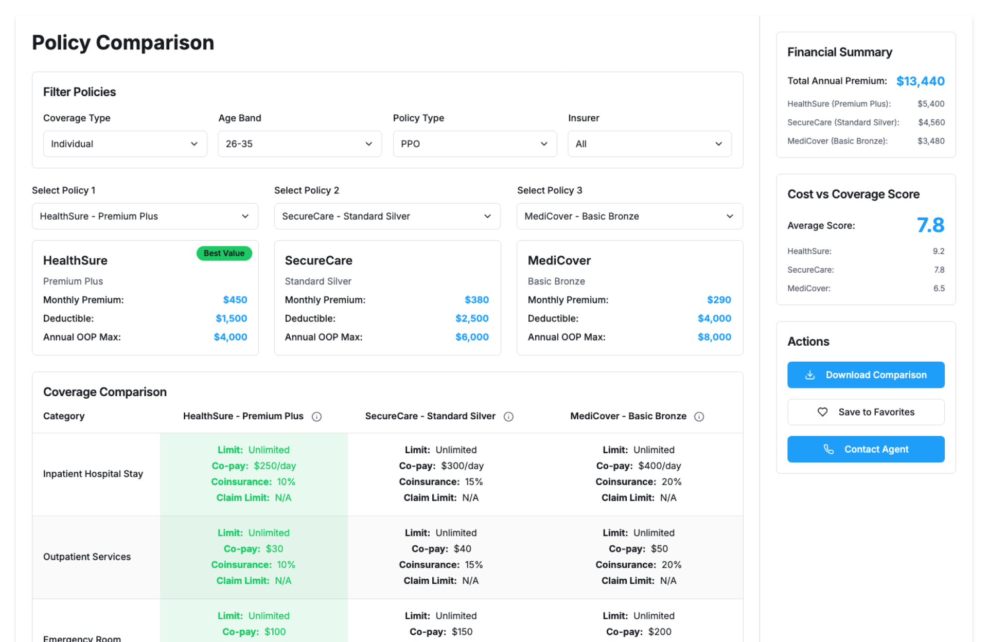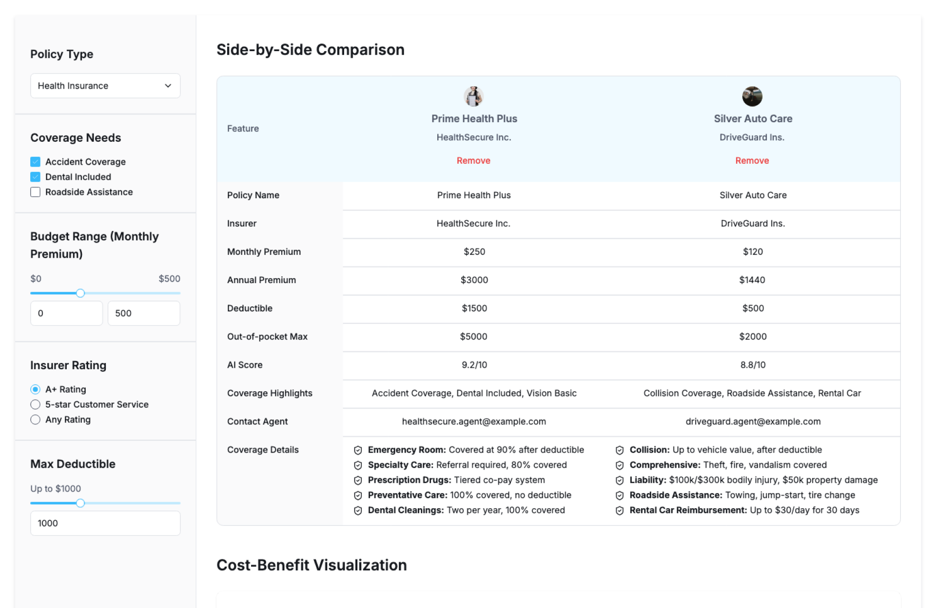 - Side-by-side comparison of multiple insurance policies