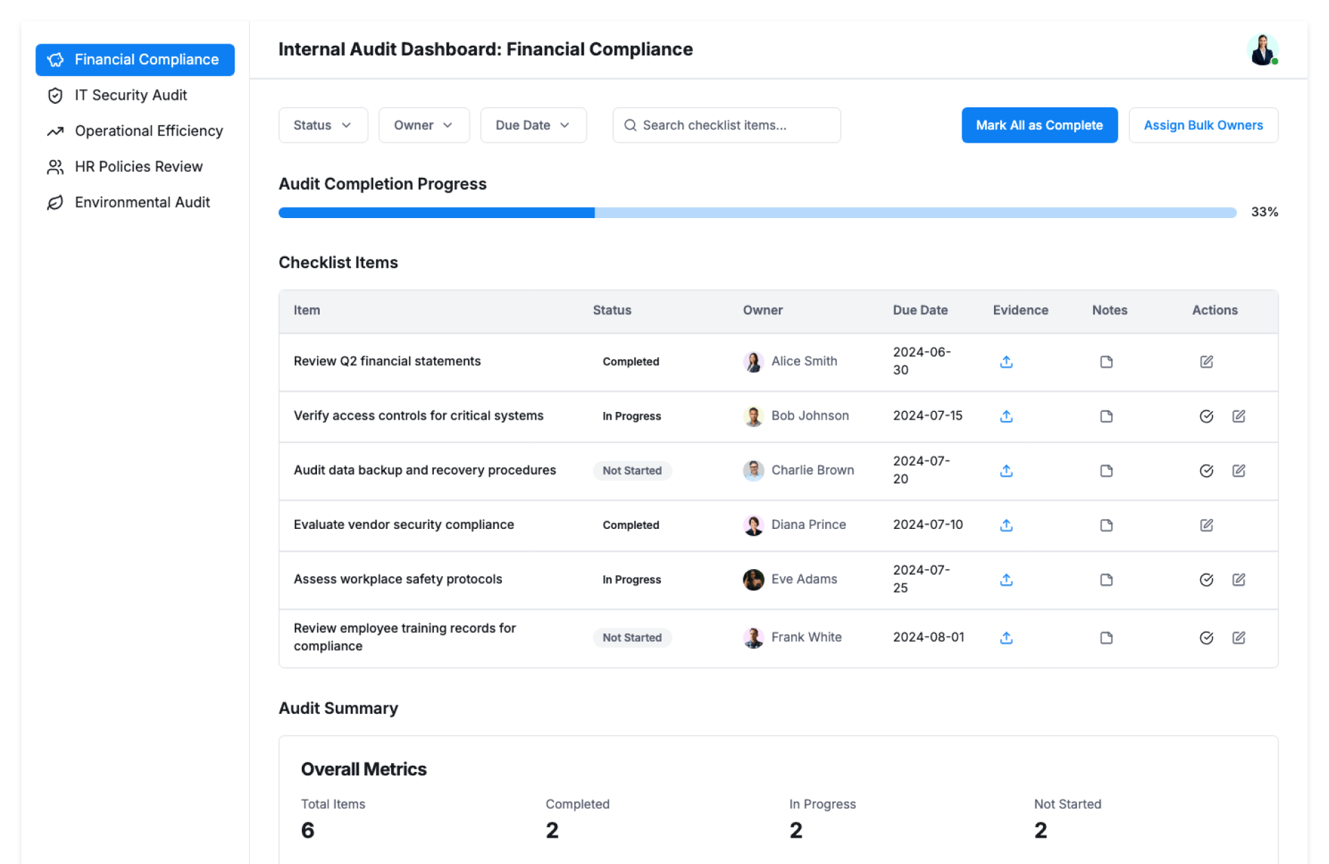 | Internal Audit Teams | Track audit progress and findings efficiently |