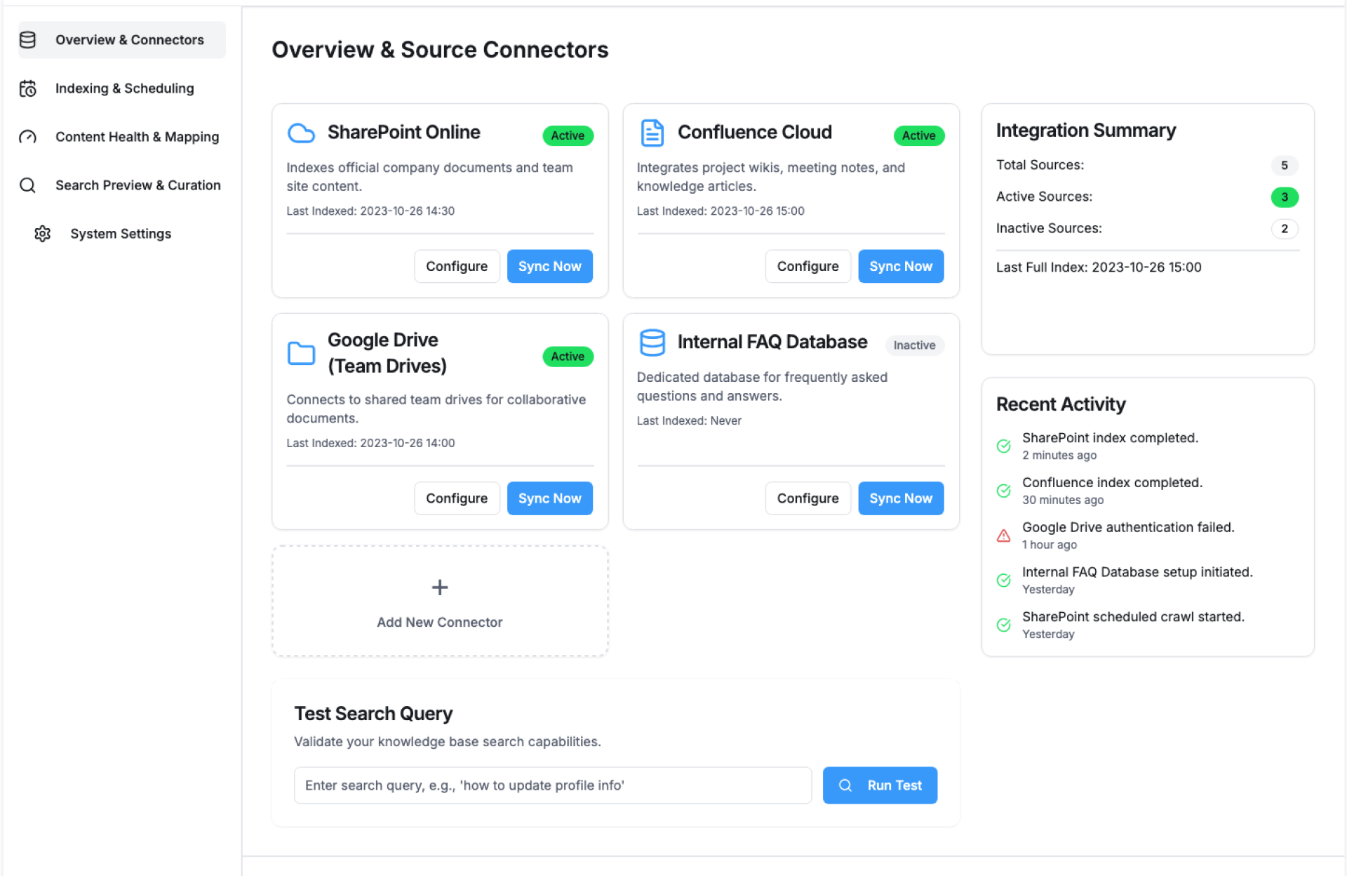 - Multi-source ingestion (PDFs, Docs, Wikis, Databases)