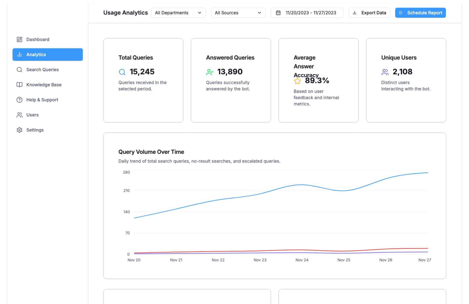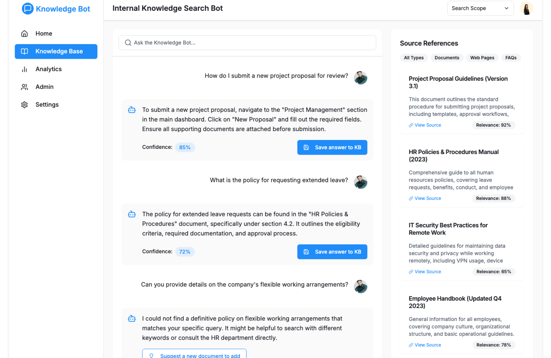 The bot can search documents, PDFs, wikis, policies, SOPs, knowledge bases, and structured data sources.