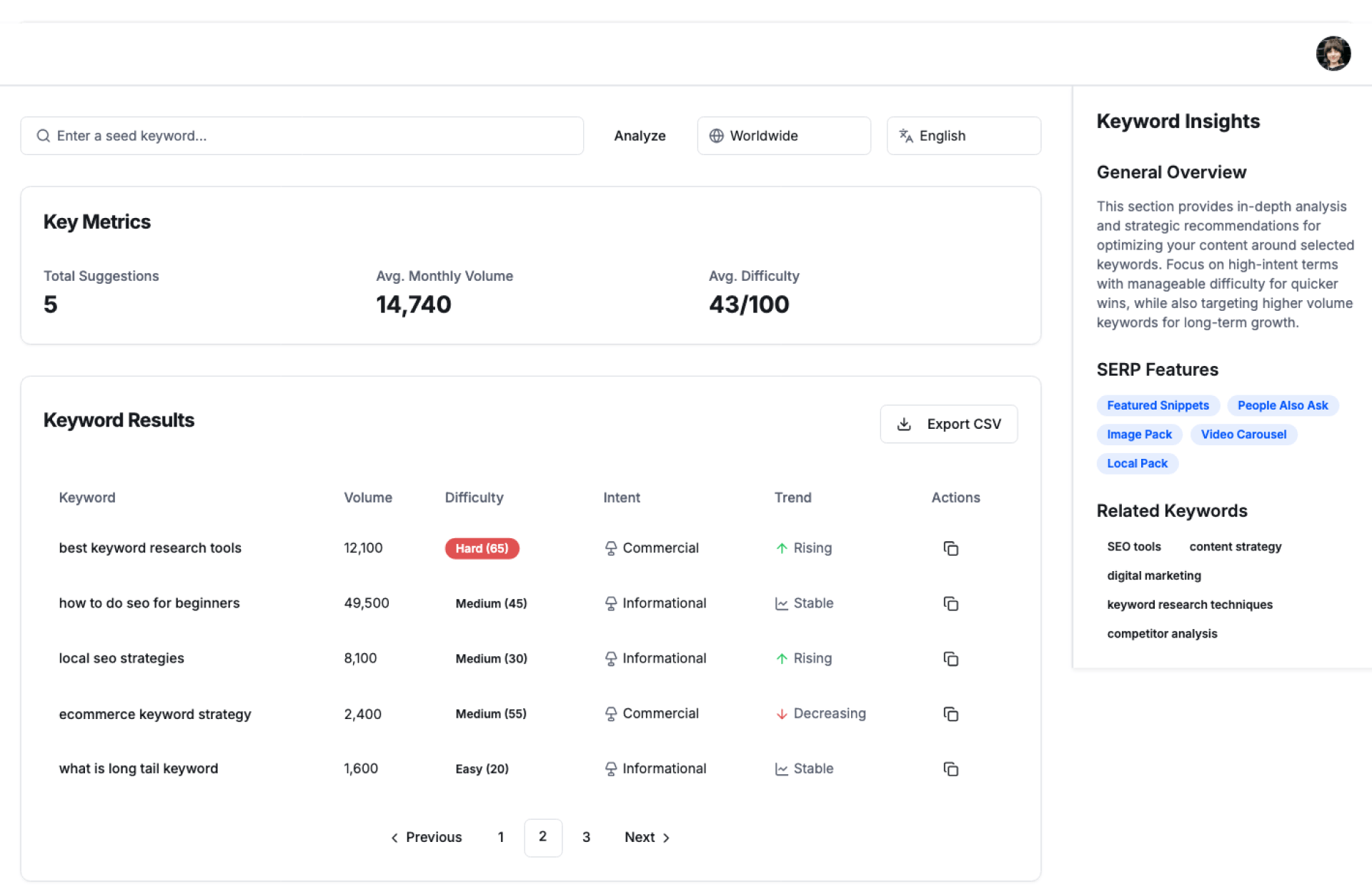 The Keyword Suggestion Tool helps you generate, analyze, and prioritize keyword ideas based on search intent, relevance, and competitiveness. Powered by AI, it transforms raw keyword data into actionable insights—helping you plan SEO, PPC, and content strategies with confidence.