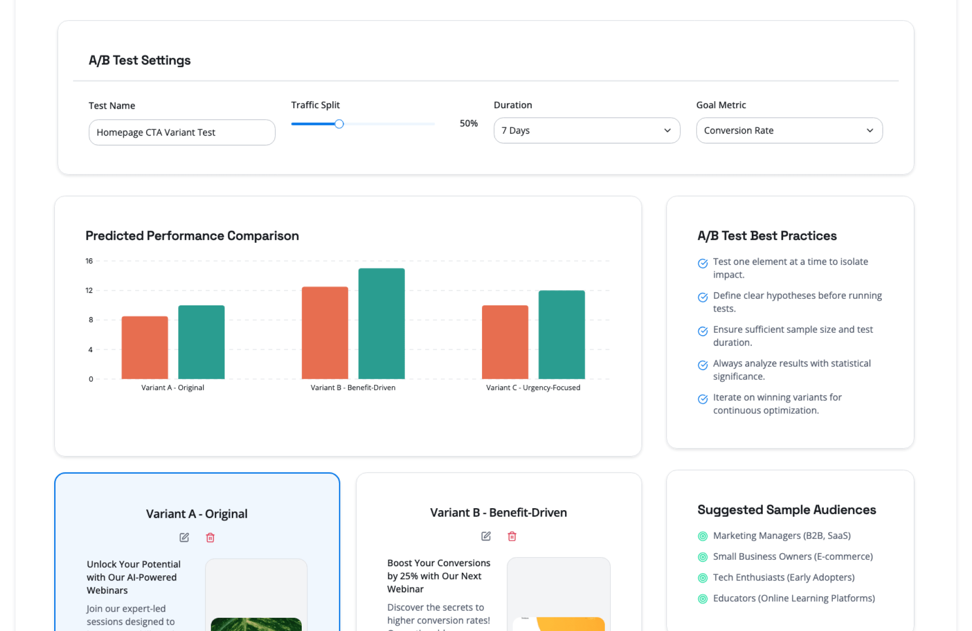 | Growth Marketers | Test headlines and CTAs to improve conversions |