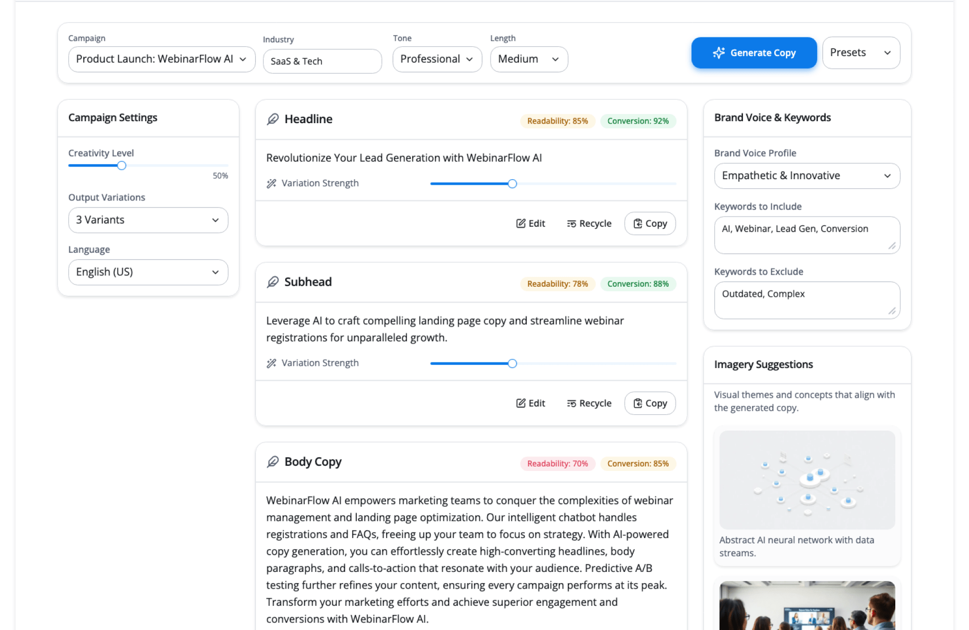 - Generate Copy – Get multiple headline, body, and CTA options