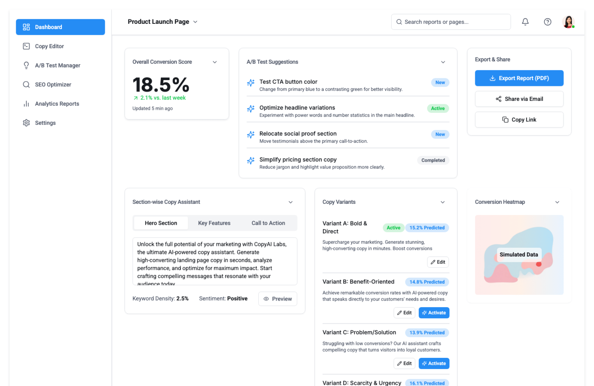 The Landing Page Copy Assistant is a ready-to-use AI solution that generates structured, high-impact landing page content tailored to your product, audience, and goals. It guides users through messaging frameworks, suggests optimized copy variants, and ensures consistency across all landing page sections.