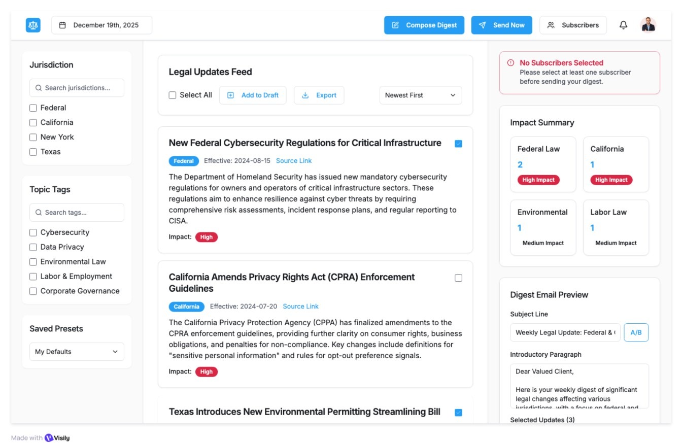 The Law Change Digest Mailer is an AI-powered solution that monitors legal and regulatory updates across selected jurisdictions and topics, then converts them into concise, easy-to-read email digests. Users receive only relevant updates, tailored to their industry and responsibilities.