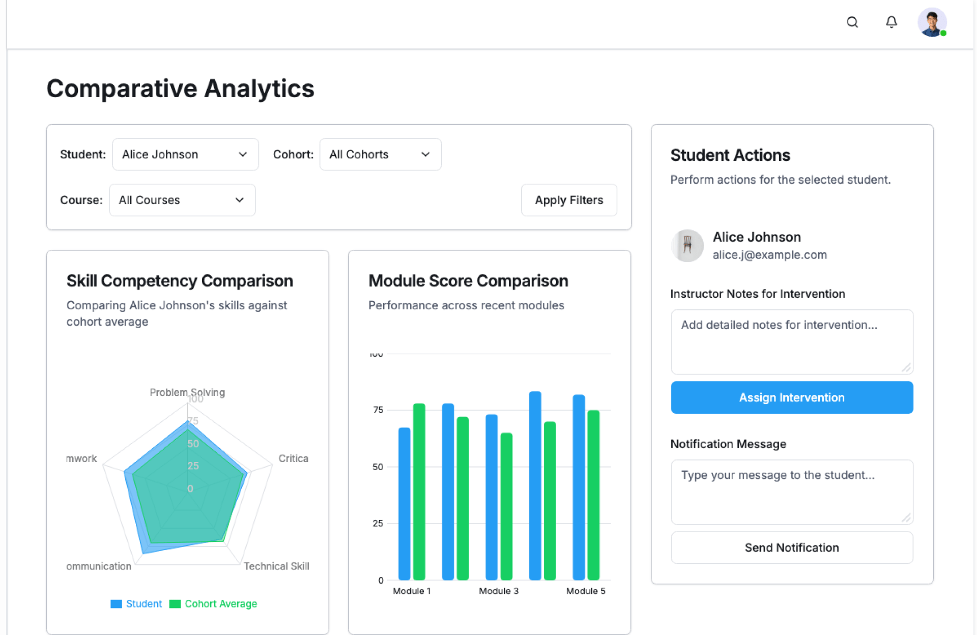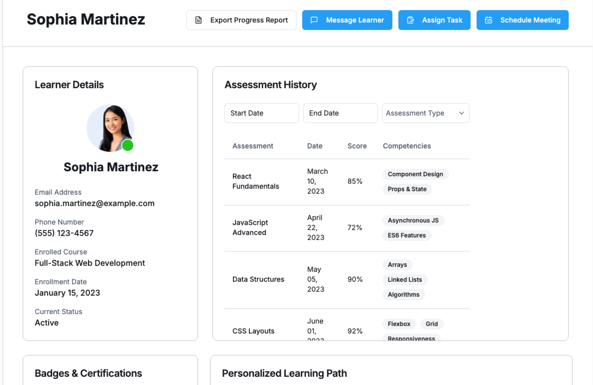 - Filters by course, batch, or learner