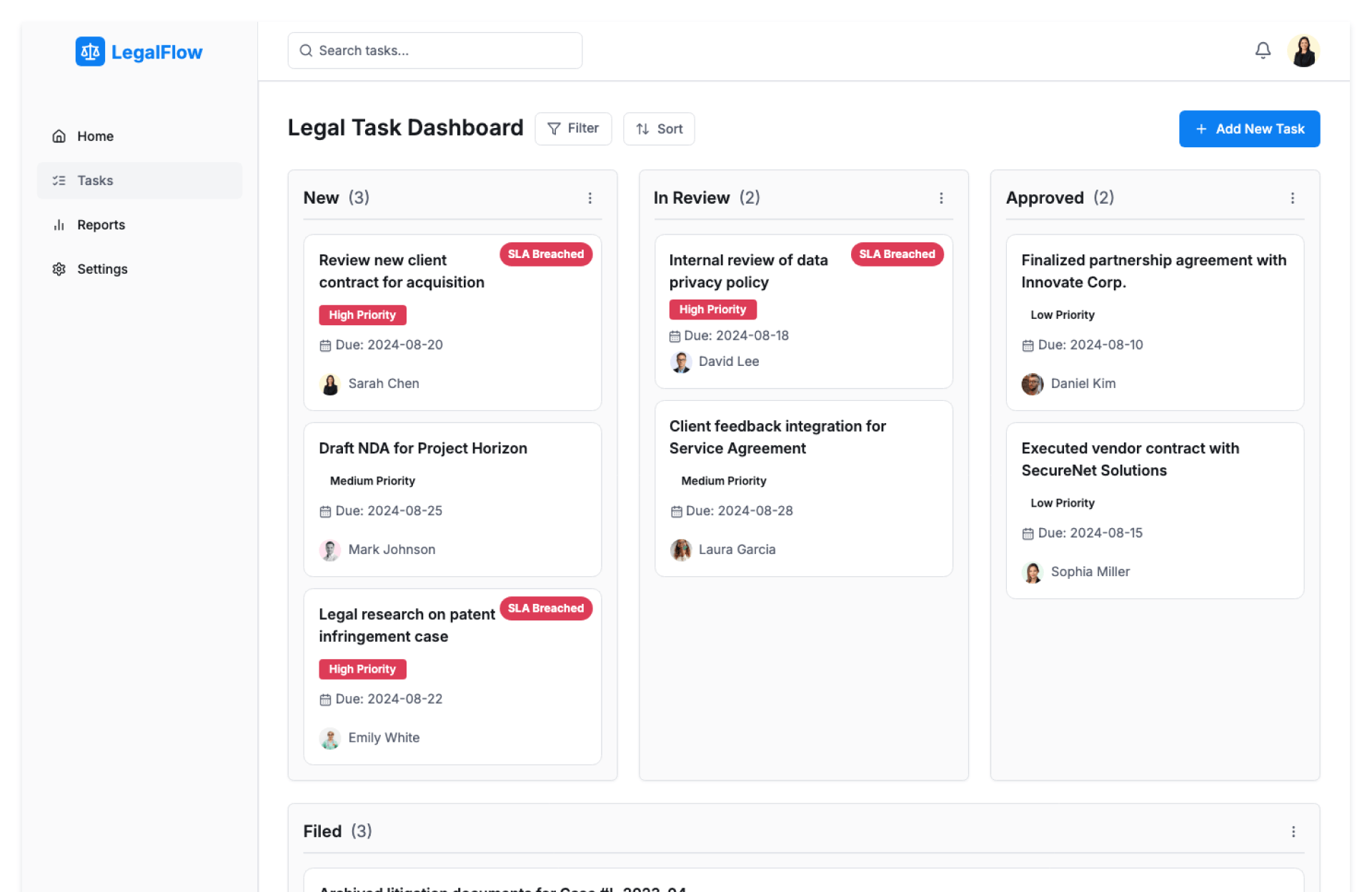 - Centralized legal task dashboard