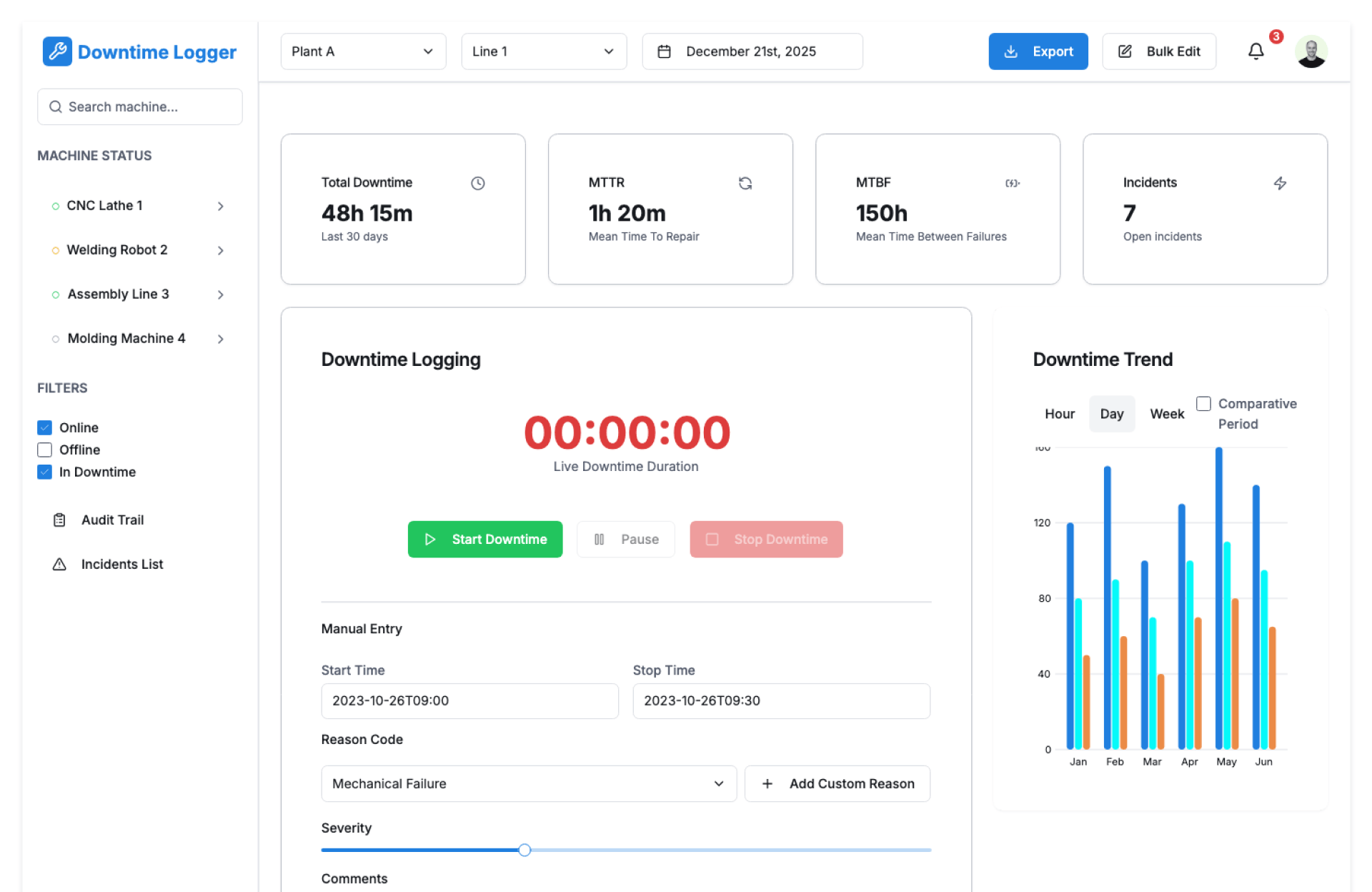 - Log Downtime Events – Record stoppages as they occur