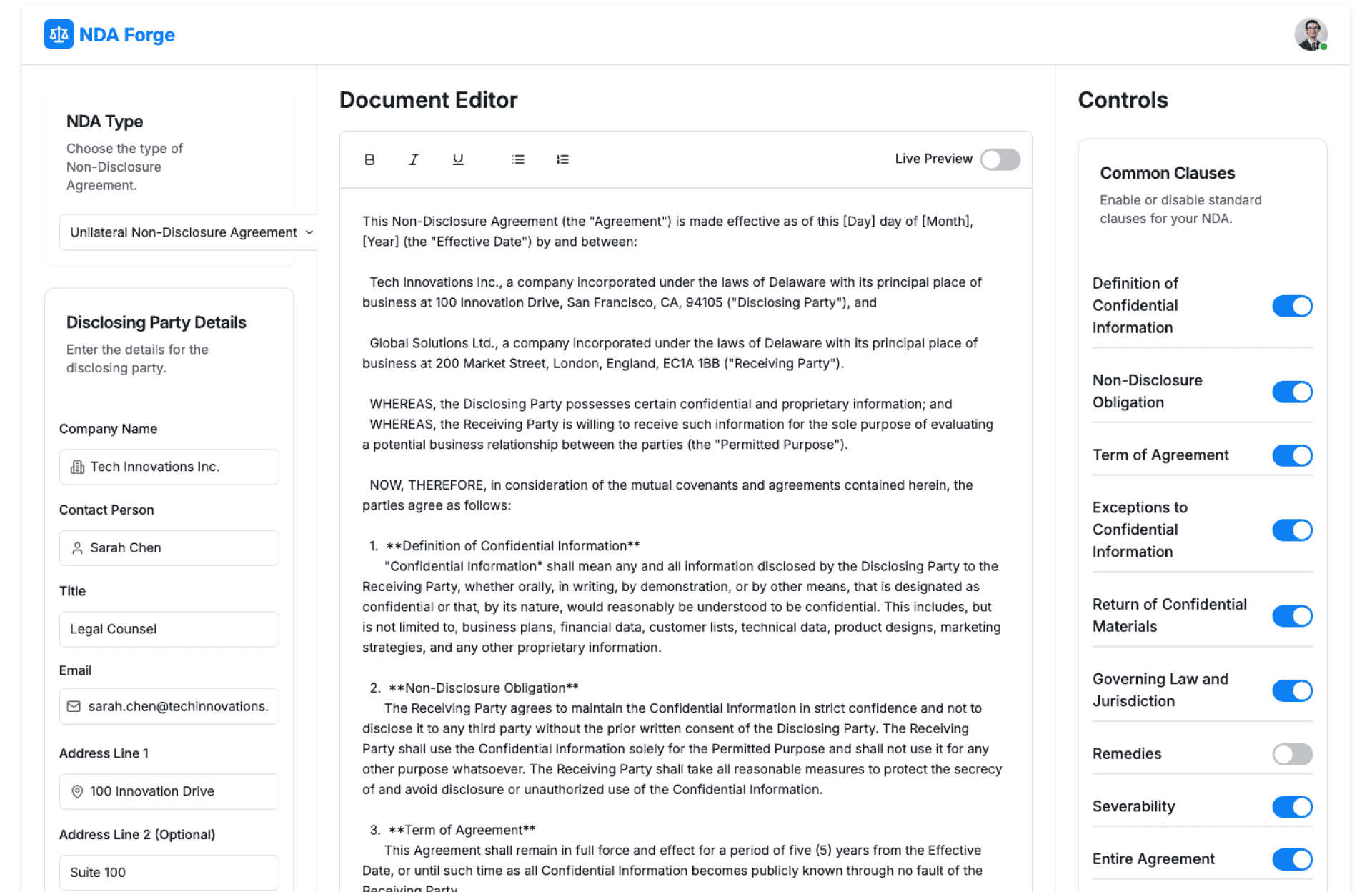 - Enter Key Details – Parties, jurisdiction, and NDA type