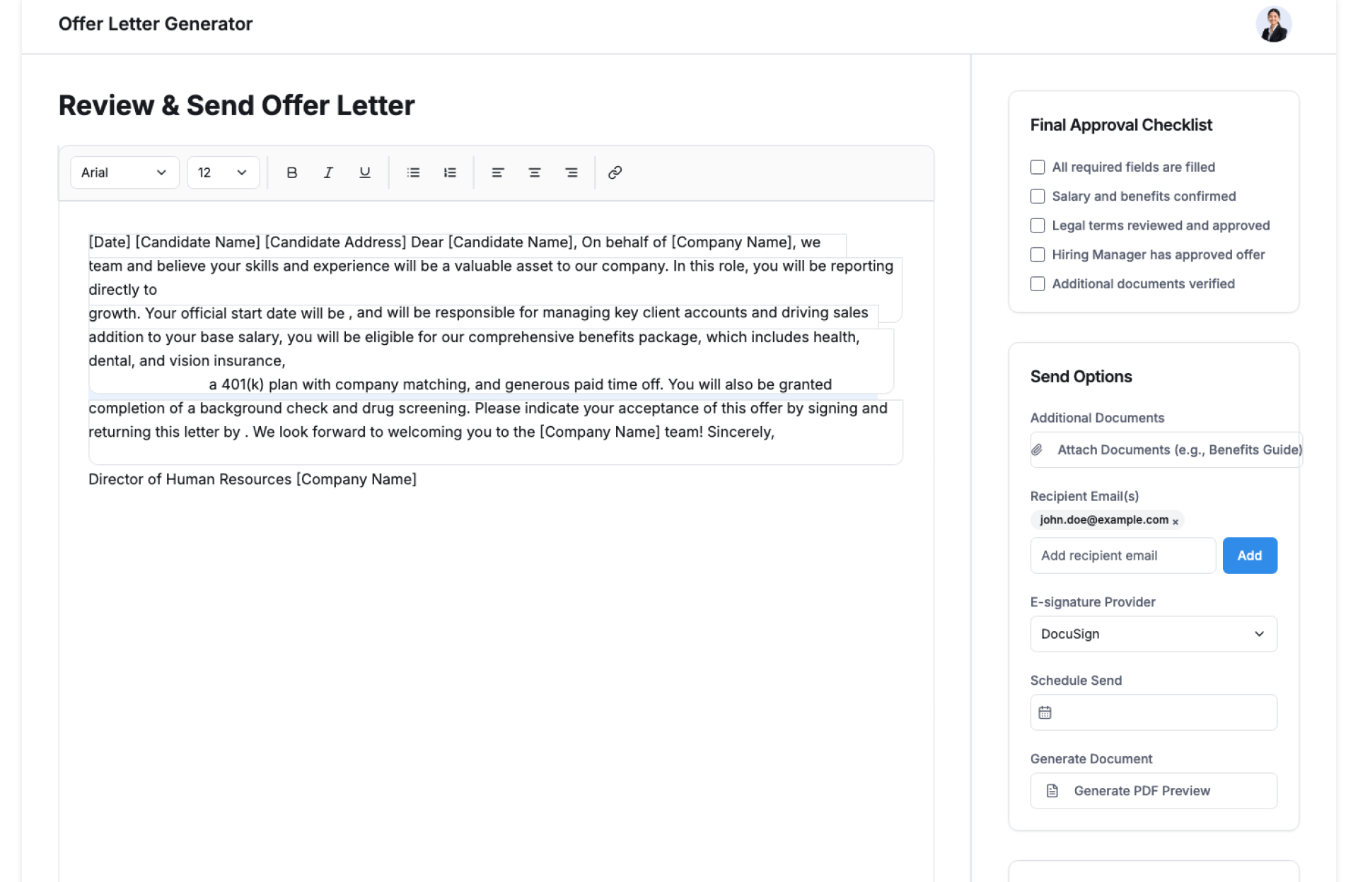 - Generate & Share – Export and send the final offer letter