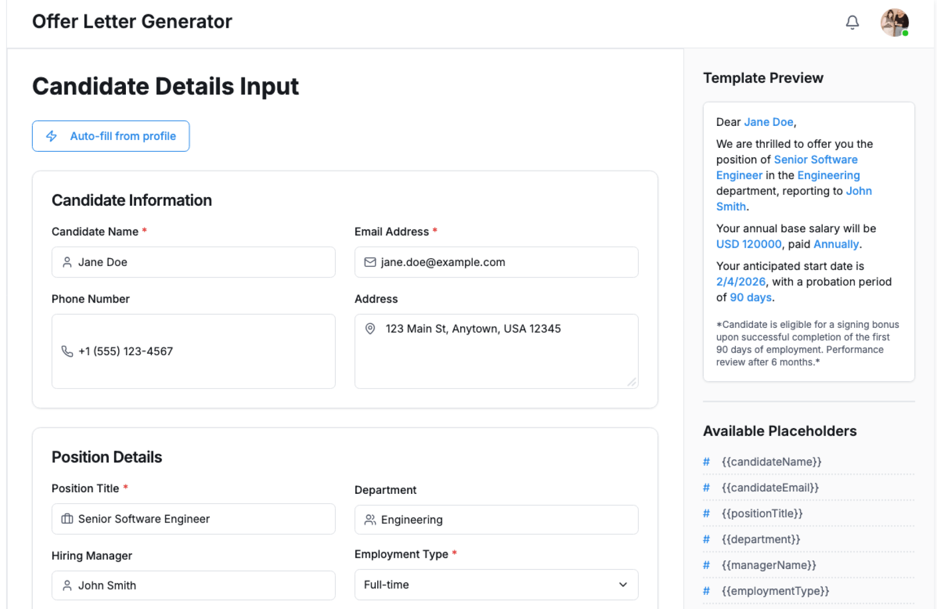 - Auto-fill candidate and job details