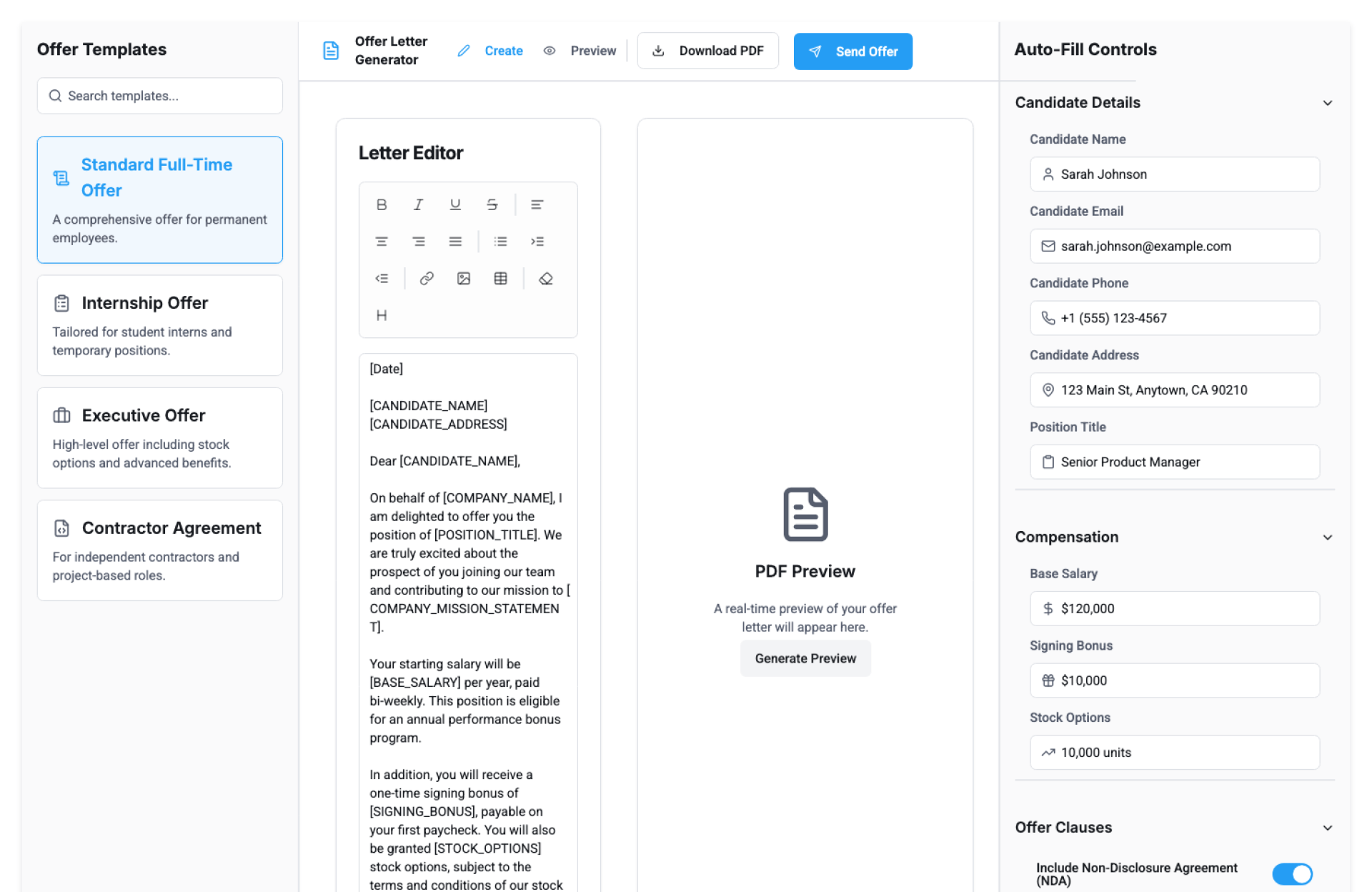 - Generate & Share – Export and send the final offer letter