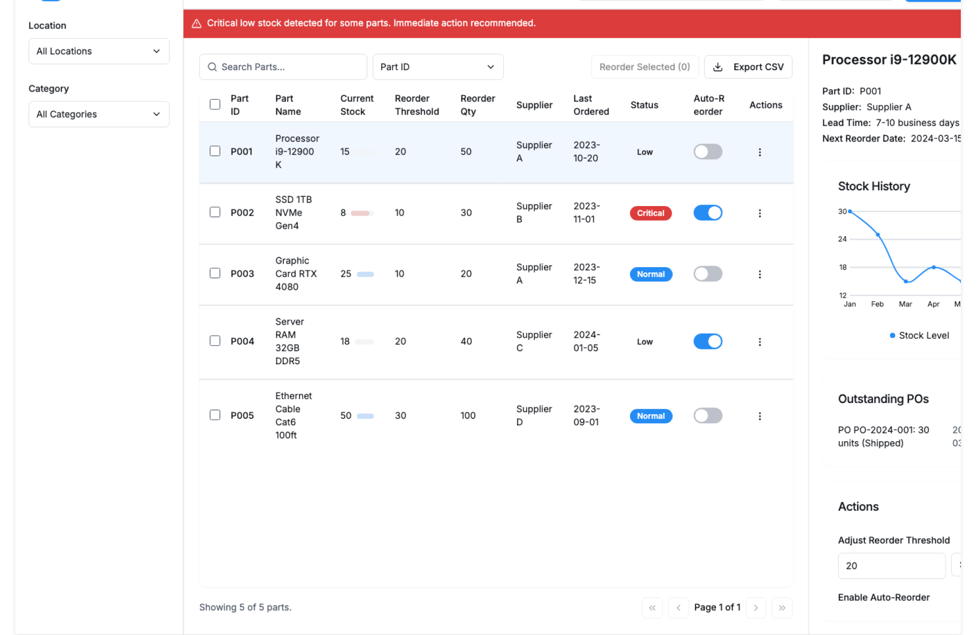 The Part Inventory Reorder Notifier is an AI-powered solution that tracks inventory quantities and automatically notifies teams when parts need replenishment. It centralizes part data, reorder points, and supplier details to support proactive inventory management.