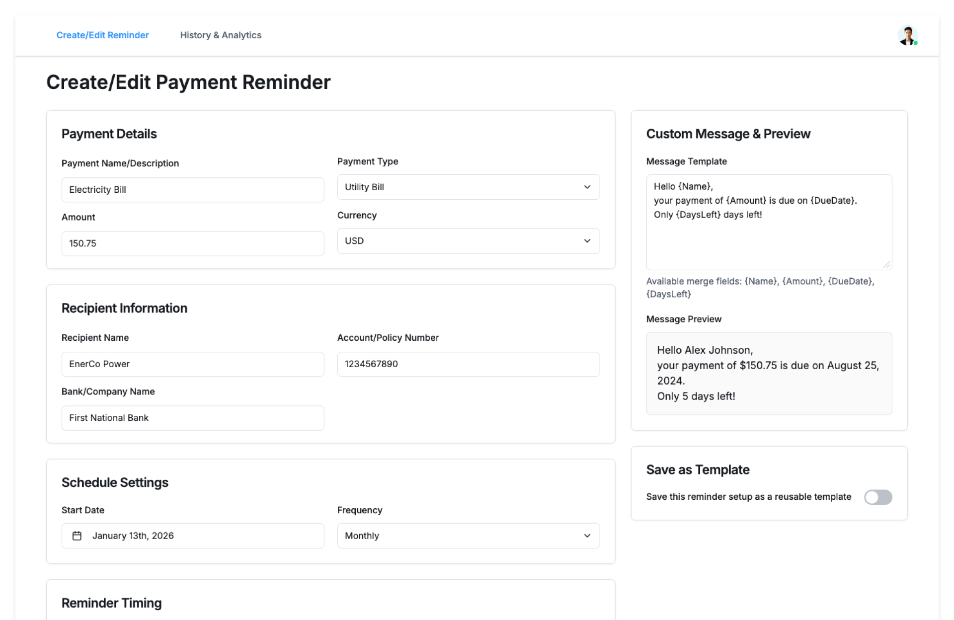 - Reminder history and status logs