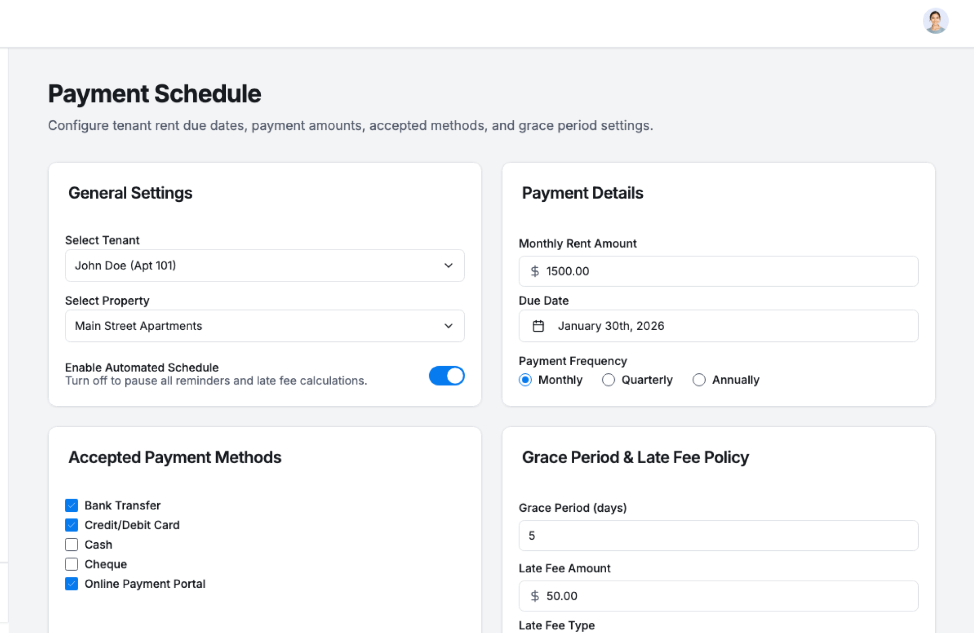 - Configure Due Dates – Set rent schedules per tenant