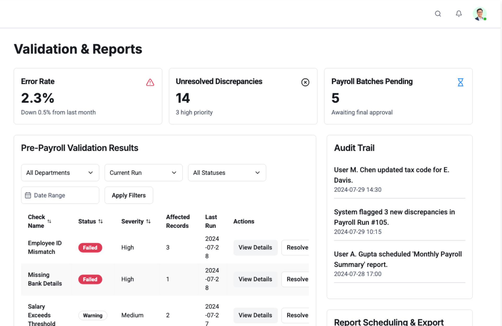 - Review Payroll Insights – Visual dashboards highlight discrepancies