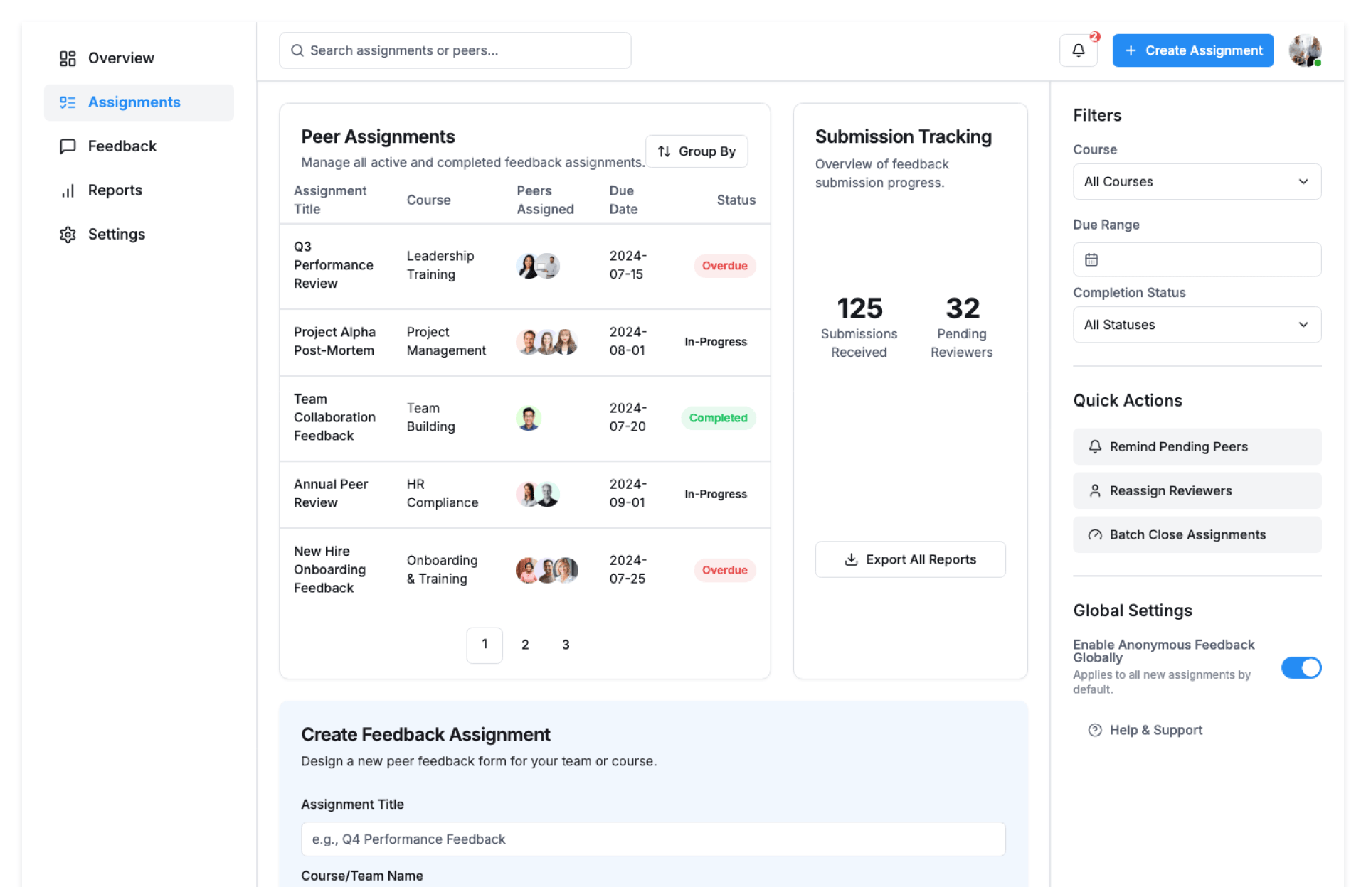The Peer Feedback Collector by Kriatix enables institutions and training teams to collect structured peer-to-peer feedback effortlessly. It standardizes how learners review each other’s work, ensuring feedback is fair, actionable, and easy to analyze.