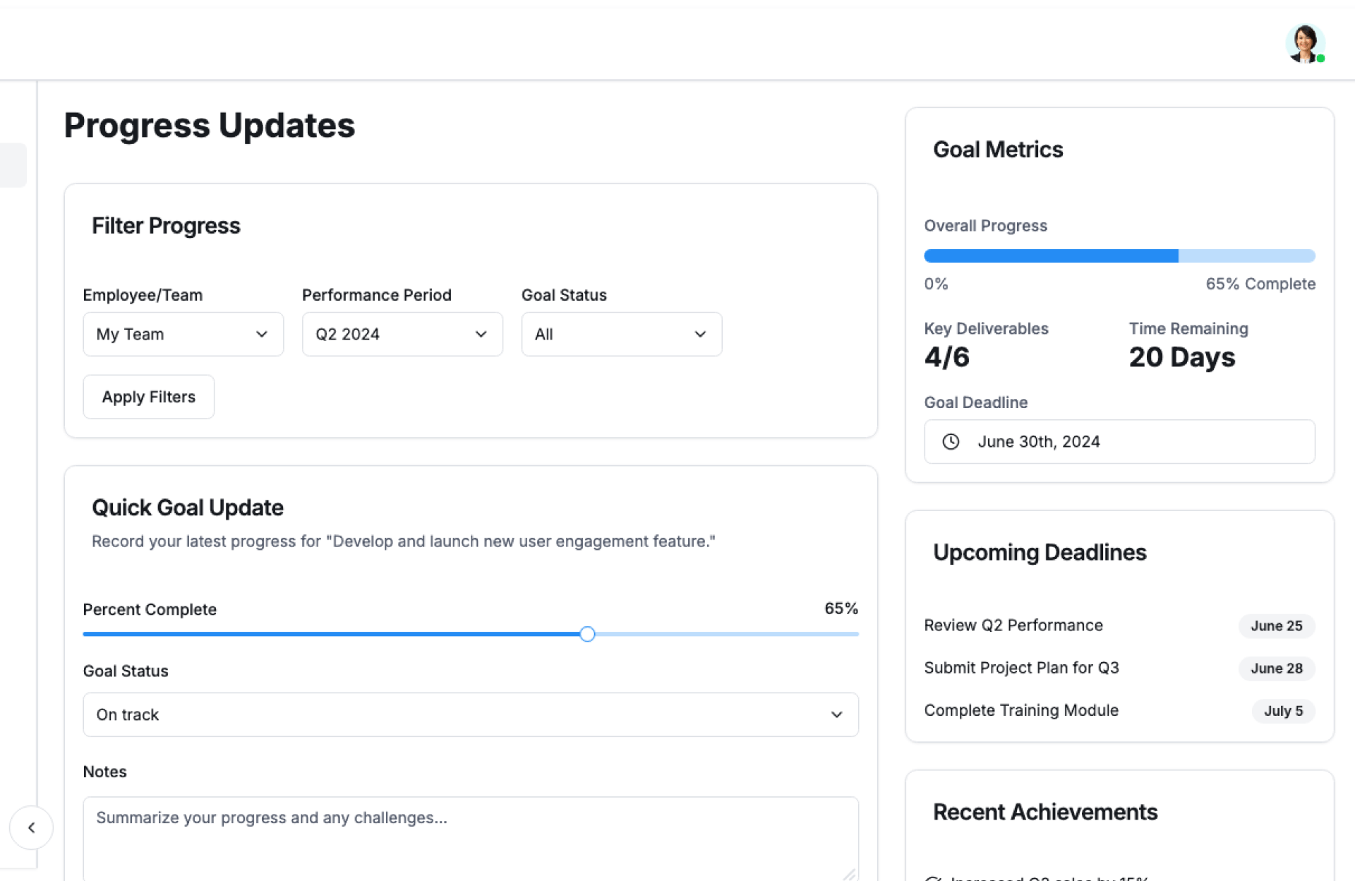 The Performance Goal Tracker App by Kriatix is an AI-powered solution designed to help organizations set, monitor, and achieve individual, team, and organizational goals from one centralized dashboard. Whether you’re managing employee KPIs, OKRs, or project-based targets, this app ensures clarity, accountability, and continuous performance improvement.