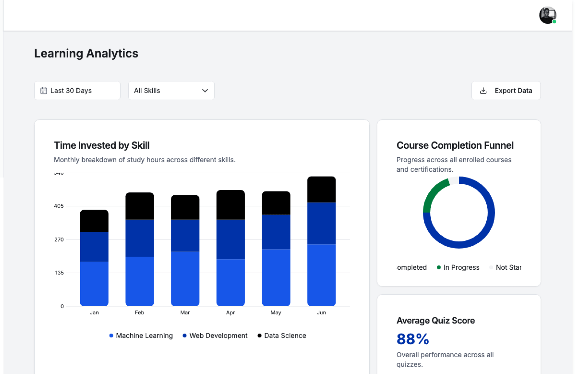 Yes, dashboards provide real-time visibility into learner progress and performance.