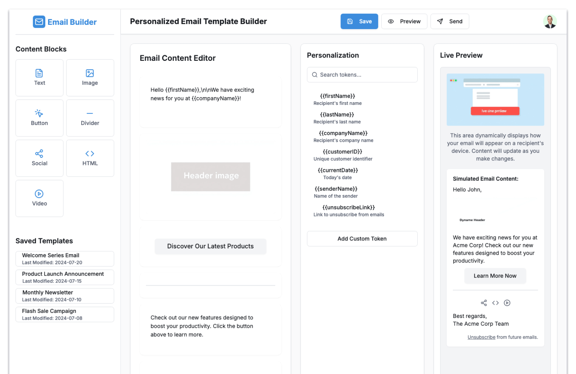 The Personalized Email Template Builder is a ready-to-use tool that allows teams to create reusable email templates with dynamic personalization fields. It supports customer-specific details such as name, product, offer, or behavior making every email feel tailored without manual editing.