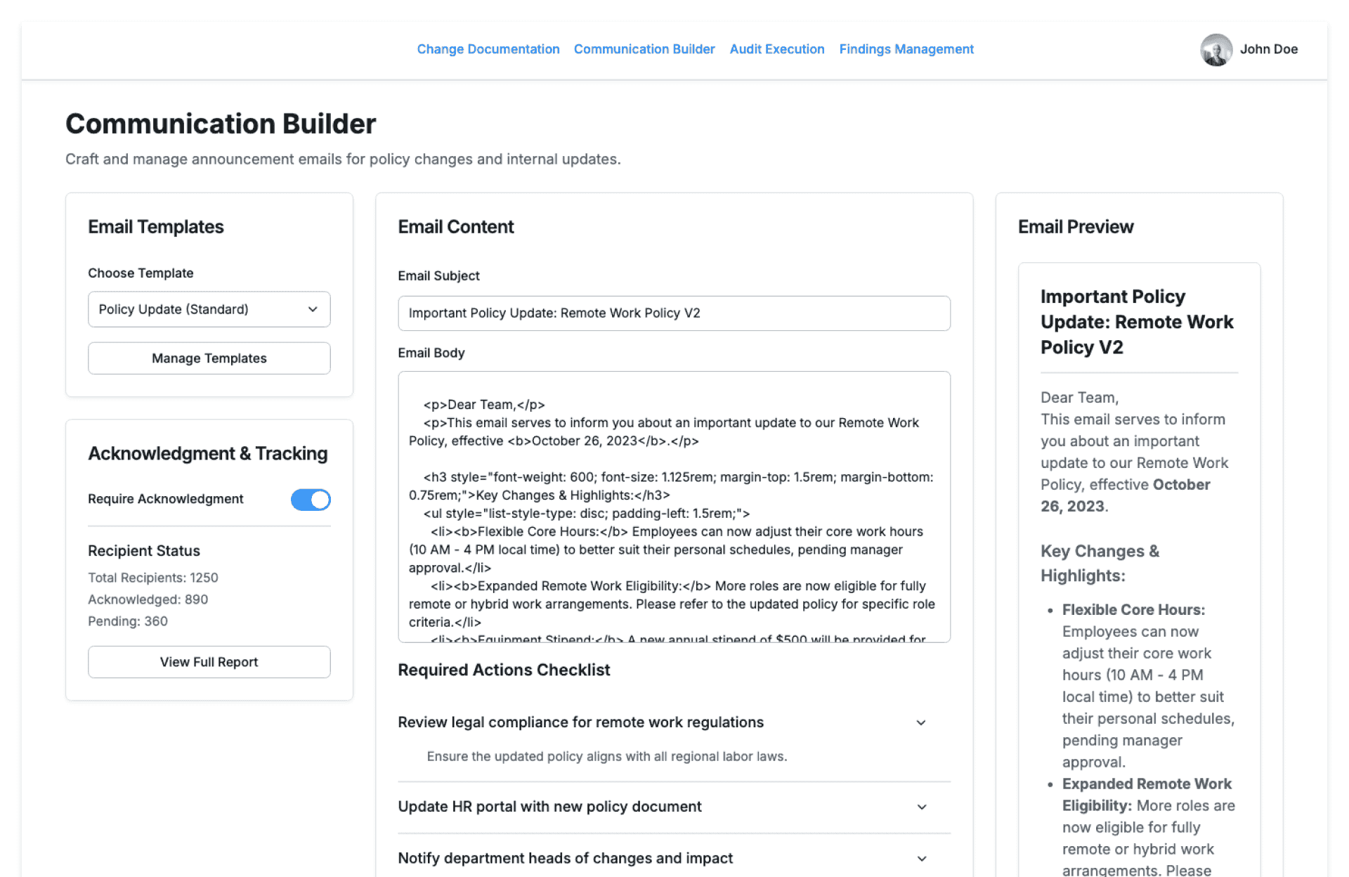 The Policy Change Announcement Mailer by Kriatix helps organizations draft and distribute clear, professional communications whenever internal policies are updated. Instead of manually crafting emails for every change, teams can quickly generate accurate, well-structured announcements that ensure employees understand what’s changing, why it matters, and when it takes effect.