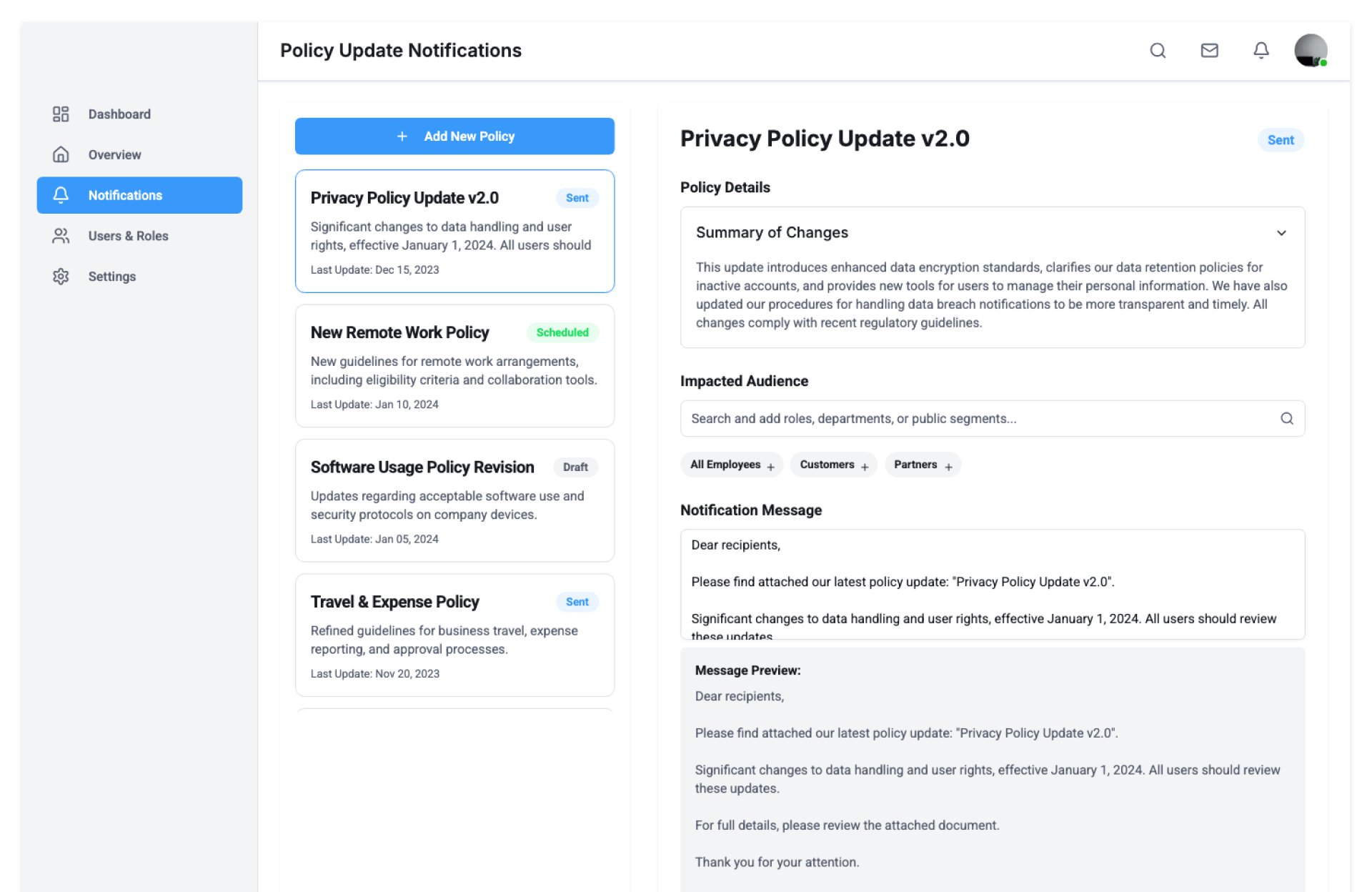 The Policy Update Notifier by Kriatix is an AI-powered solution that helps organizations track, manage, and communicate policy updates in real time. From regulatory changes and internal policies to compliance notices, this product ensures the right stakeholders are informed instantly, accurately, and consistently.
