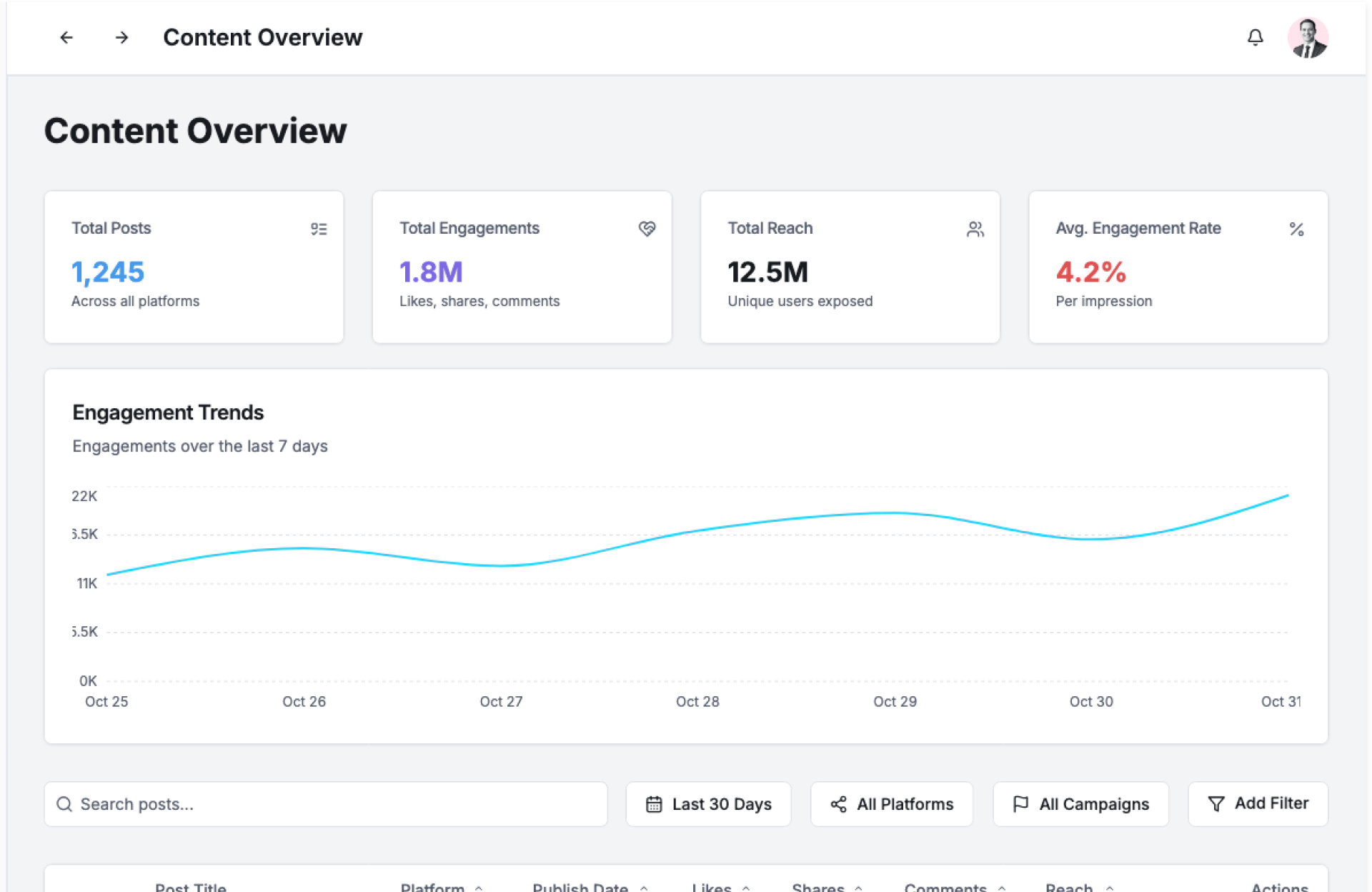 The Post Performance Dashboard is a ready-to-use application that consolidates post metrics into a single view. It helps teams understand which content drives engagement, what resonates with audiences, and where to optimize future posts without juggling multiple analytics tools.