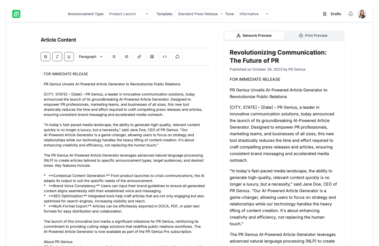 The PR Article Draft Generator by Kriatix is an AI-powered writing tool that helps teams quickly create structured, newsroom-ready PR articles. From product launches and funding announcements to leadership updates and brand stories, it turns key inputs into clear, professional drafts ready for review and distribution.