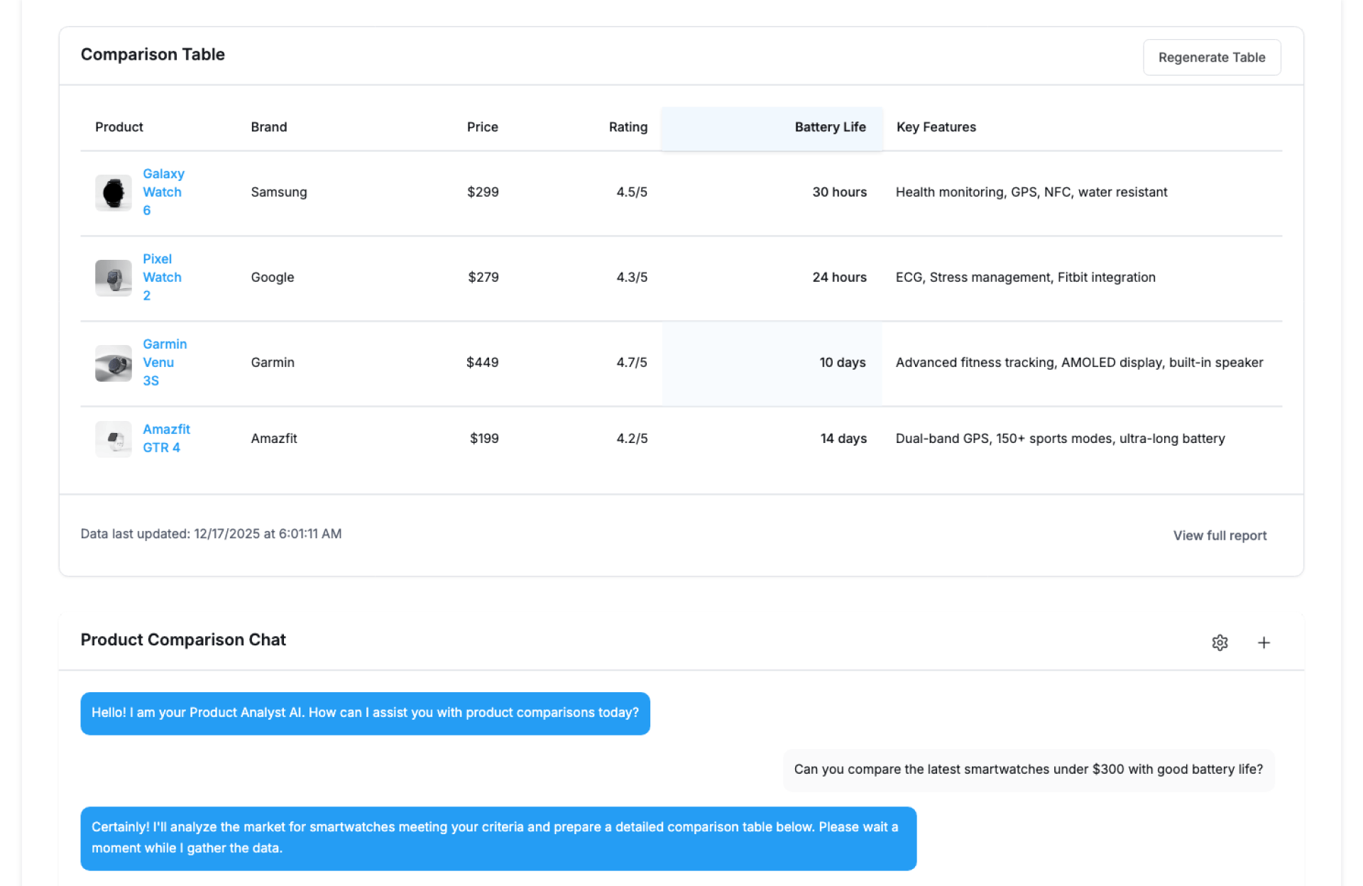 The Product Comparison Chat Assistant is a ready-to-use conversational solution that compares products based on user intent—features, pricing, specifications, pros and cons, and use cases. It dynamically adapts comparisons as users refine their questions, helping them reach confident decisions faster.