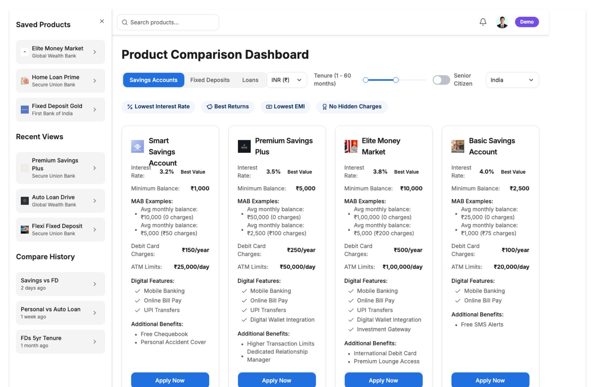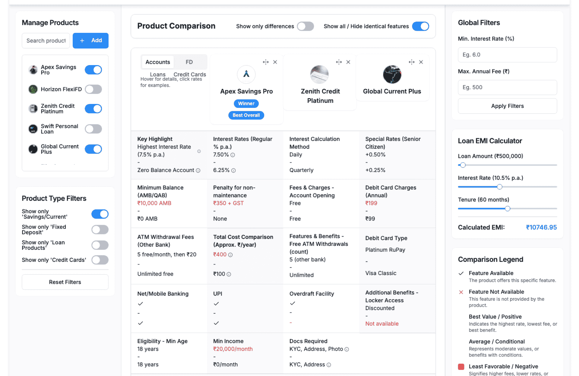 Compare savings, FD, and loan types.