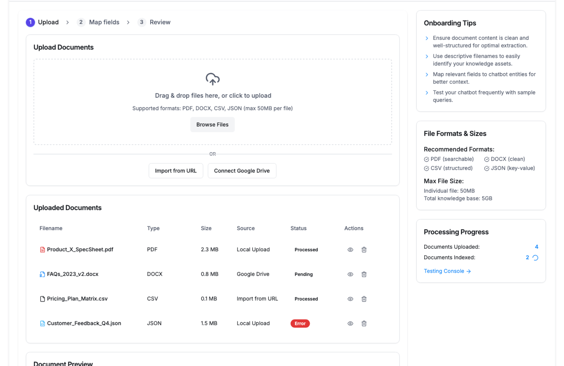 - Connect Product Data – Sync catalogs, FAQs, documents, or APIs