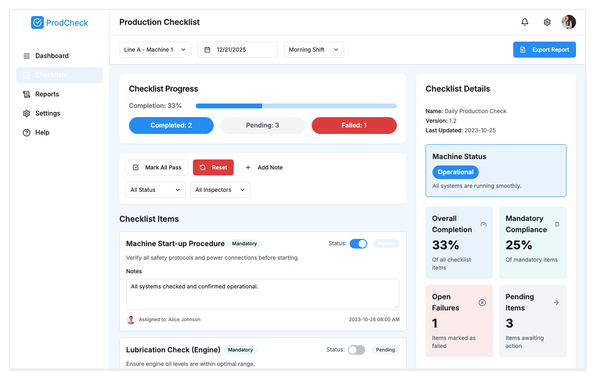Production Checklist Dashboard.