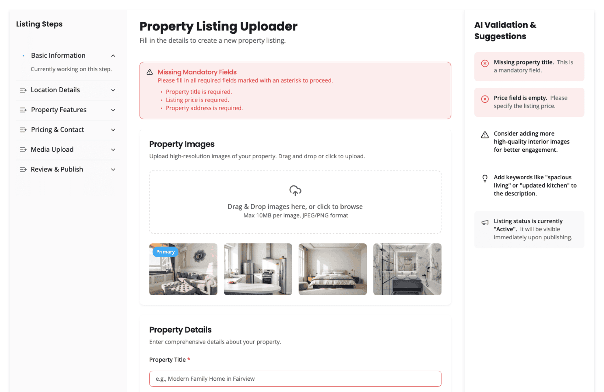 The Property Listing Uploader Bot is an AI-powered solution that automates the ingestion, validation, and publishing of real estate property data. It converts raw listing information into structured entries and distributes them to websites, portals, and internal systems from a single workflow.