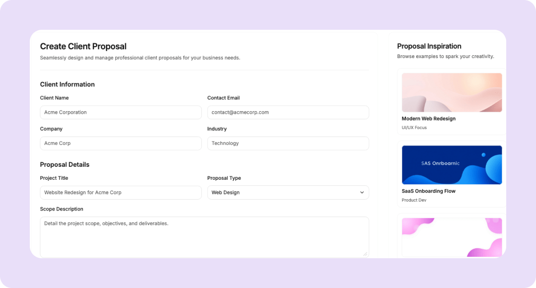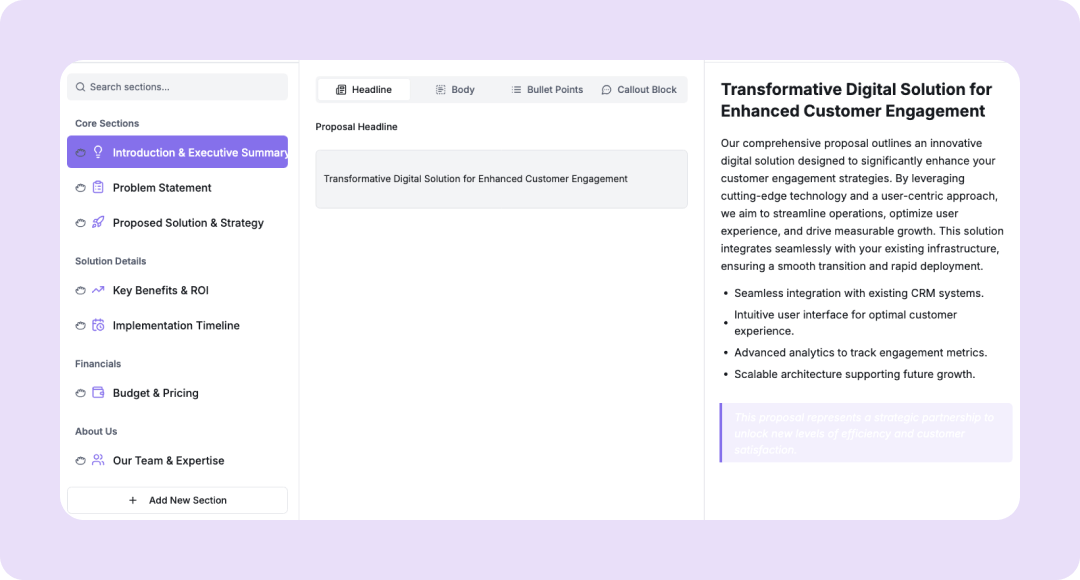 - AI Text Generator: Writes proposal summaries, intros, and deliverables
