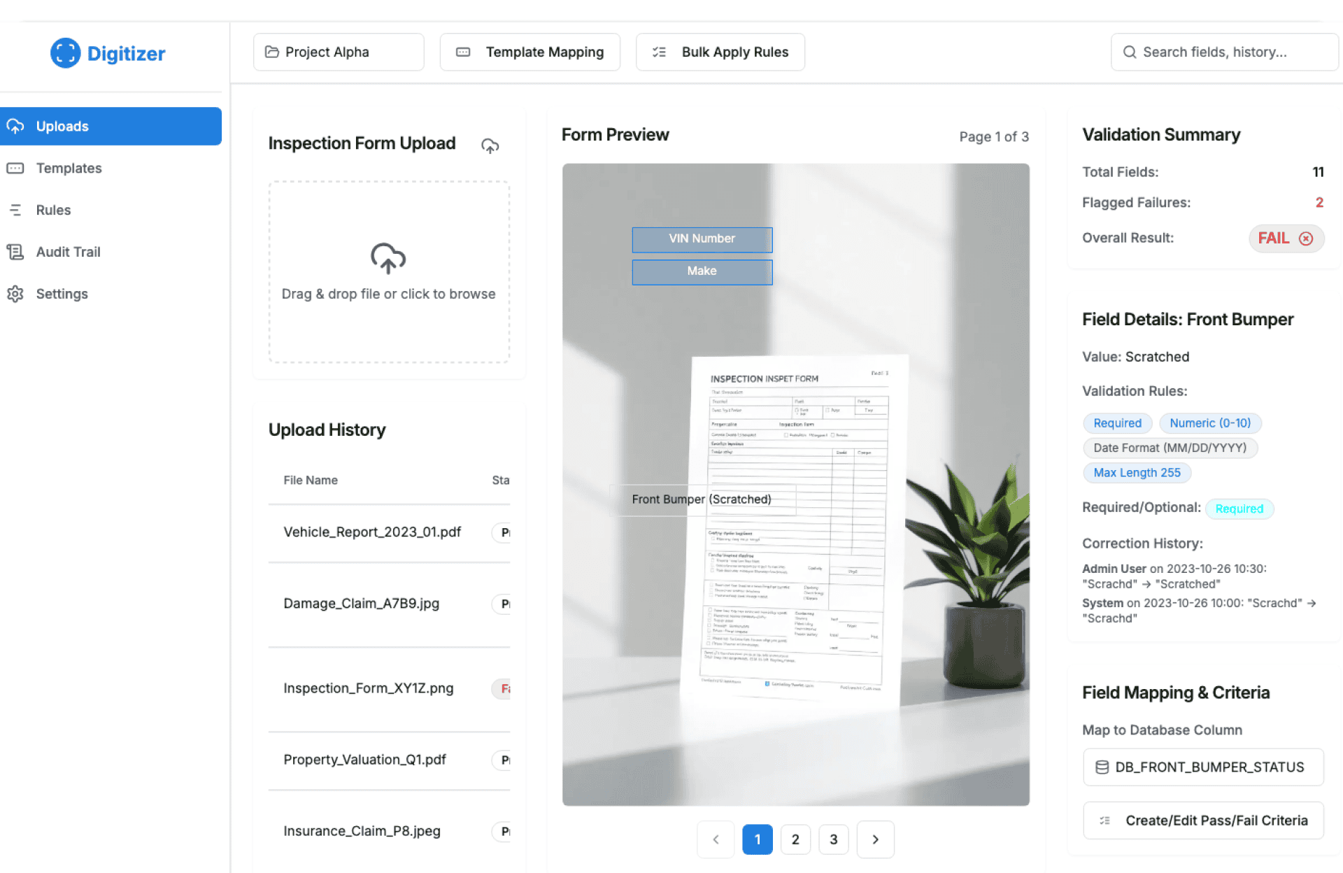 The Quality Inspection Form Digitizer is an AI-powered solution that enables teams to create, complete, and manage digital quality inspection forms. It replaces manual paperwork with standardized digital formats, making inspection data easy to capture, track, and analyze.