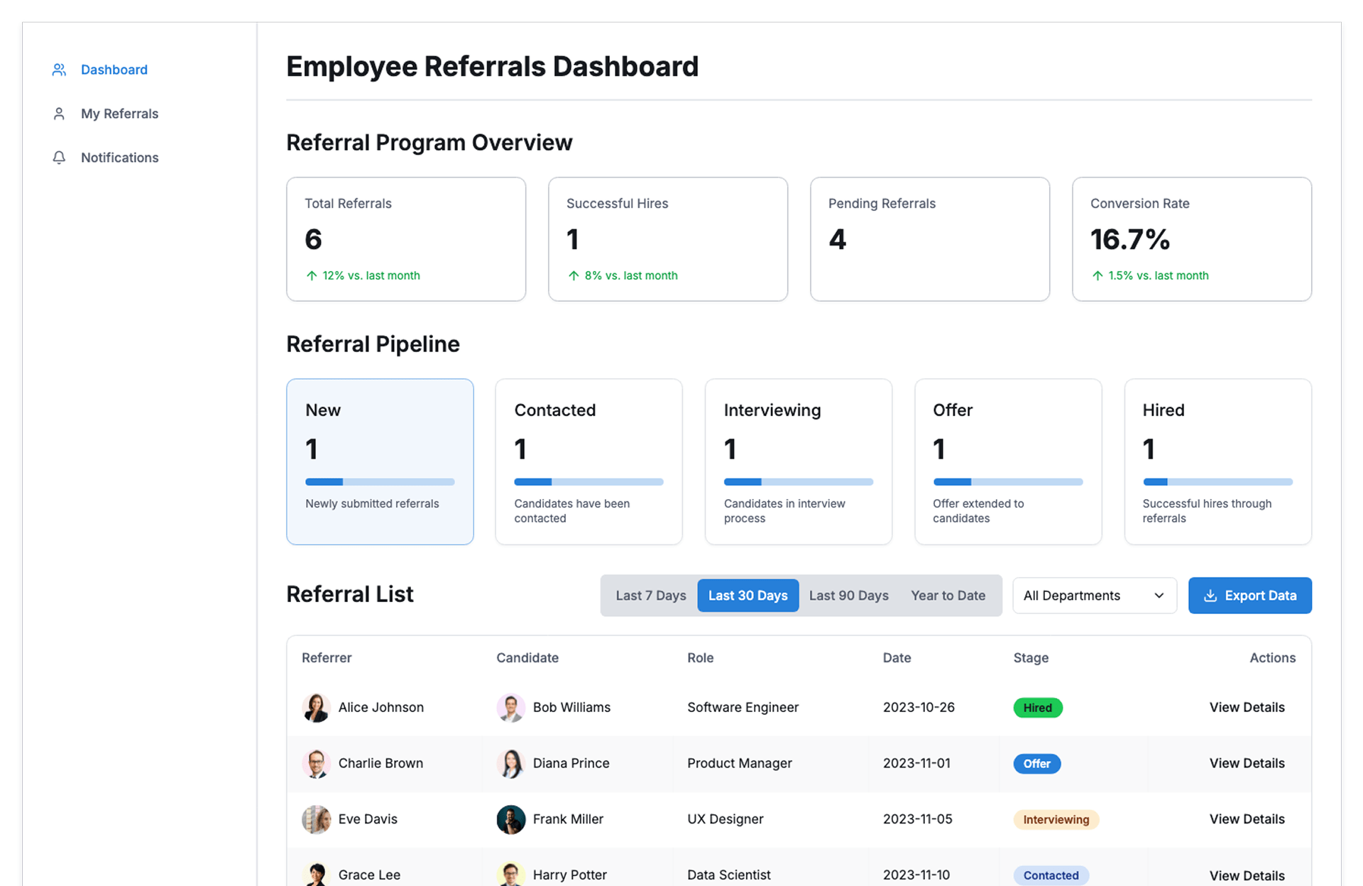 The Referral Program Dashboard is a ready-to-deploy and customizable platform that allows businesses to create, manage, and analyze referral campaigns in real time. Built on the Kriatix AI platform, it automates referral tracking, reward distribution, and performance analytics—helping you turn customers, partners, and affiliates into growth drivers.