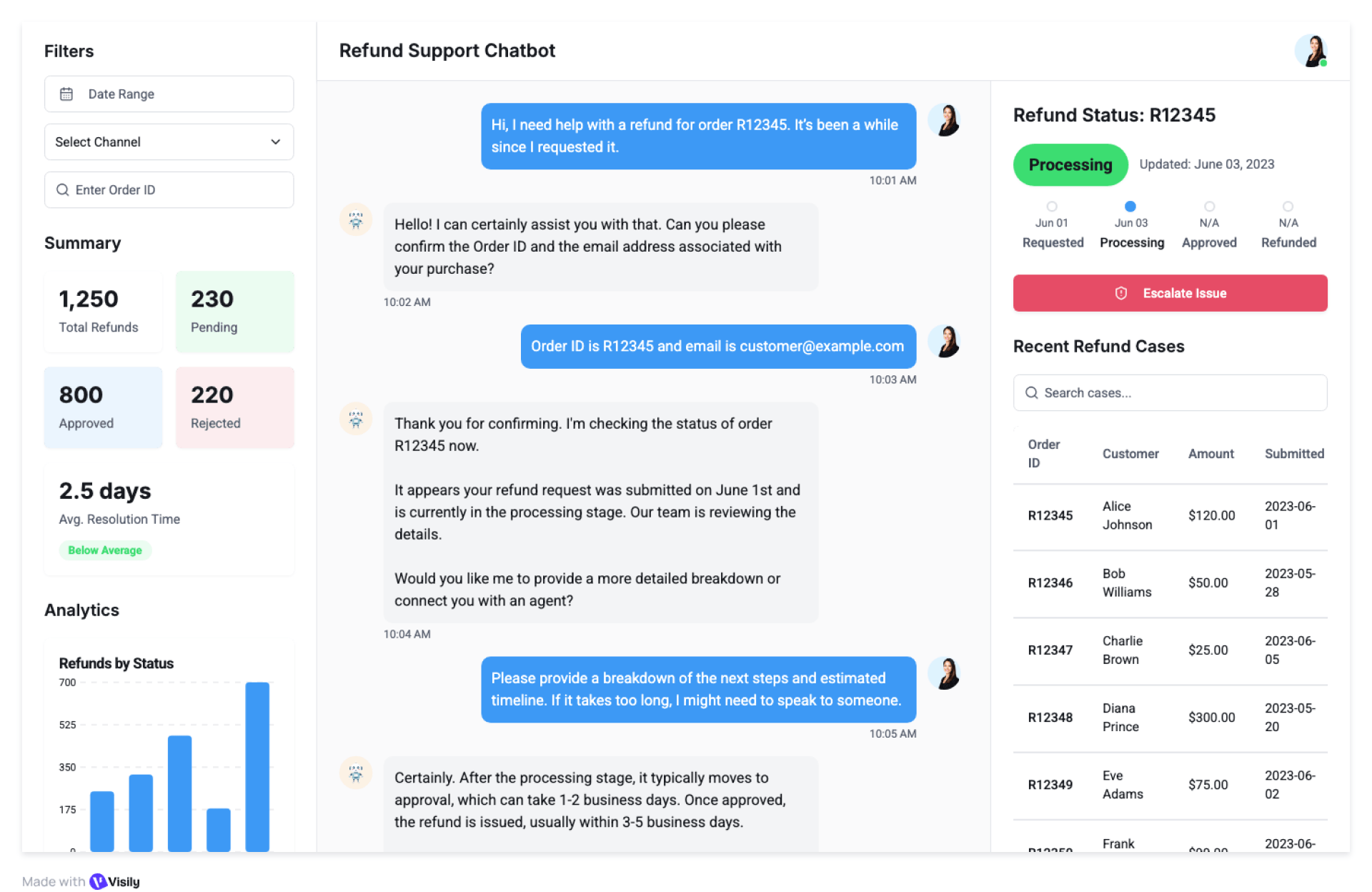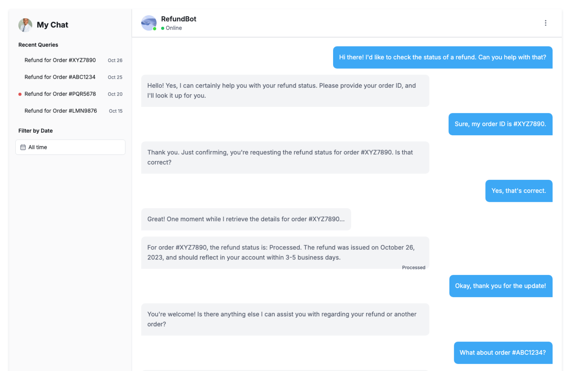 The Refund Status Chatbot is an automated conversational assistant that helps customers check the status of refunds using order or reference details. It connects with order and payment systems to deliver accurate, up-to-date refund information instantly and consistently.